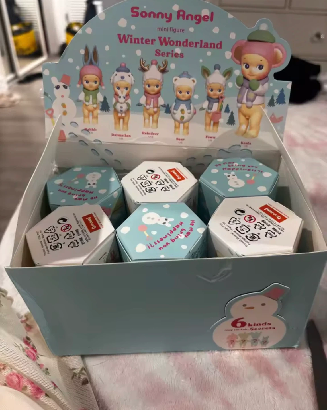 This is a Sonny Angel Winter Wonderland Series mini figure box. It contains 6 blind boxes. The series features cute animal figures like Rabbit, Dalmatian, Reindeer, Bear, Fawn, and Koala. These are collectible figures for fans.