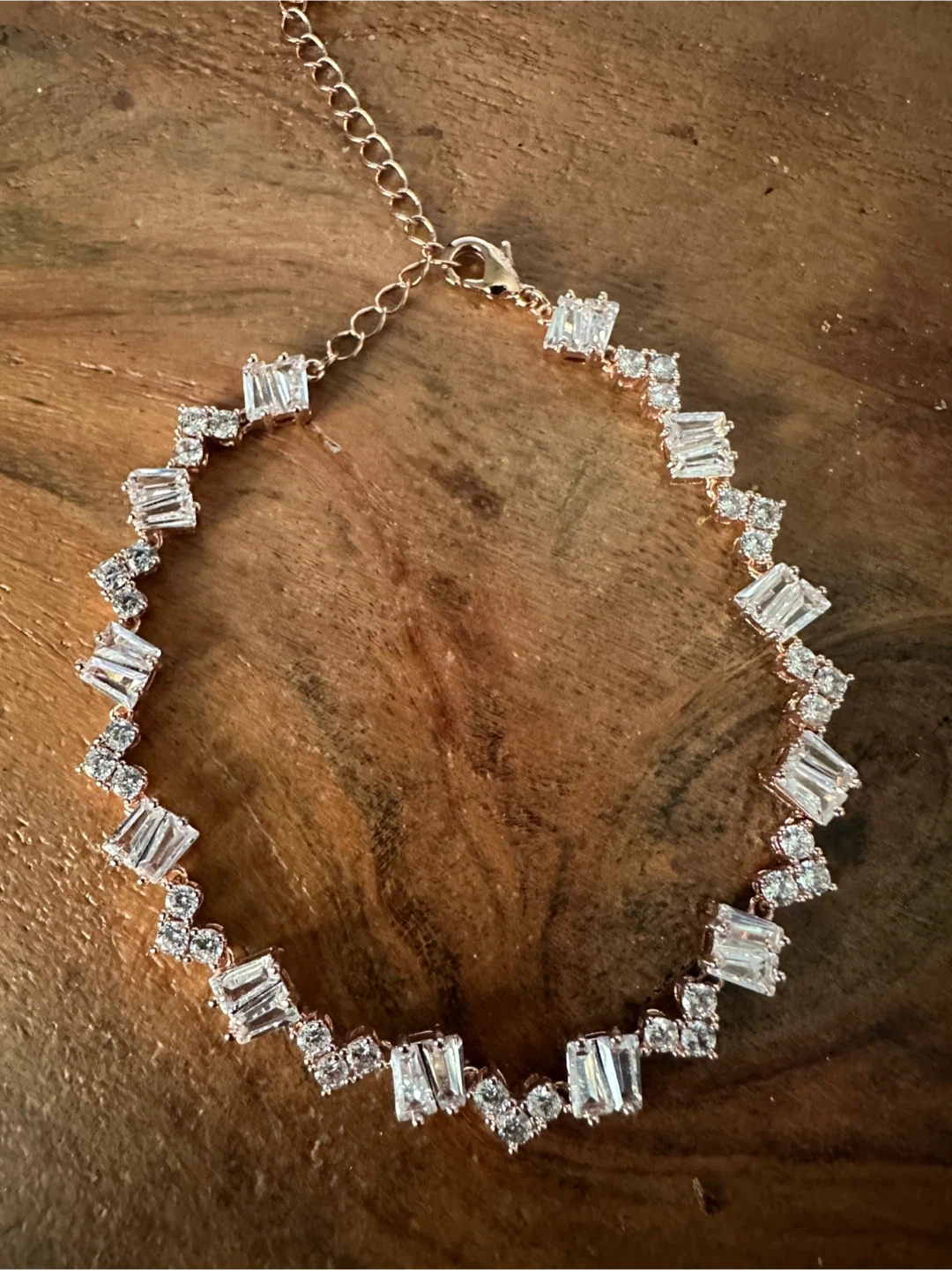 This stunning bracelet features a delicate rose gold chain adorned with alternating baguette and round clear crystals. It's sure to add sparkle to any outfit!