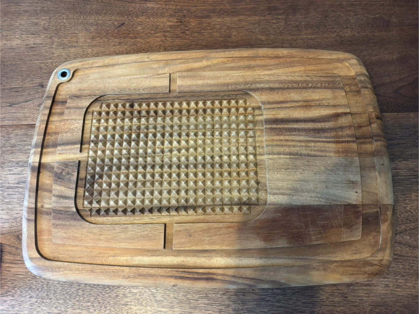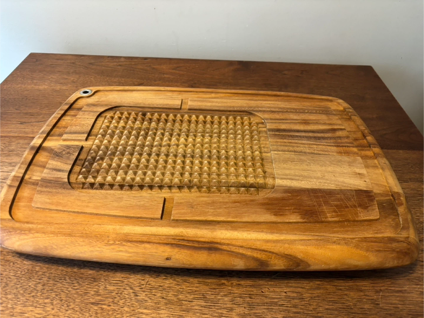 This sturdy wooden carving board features a textured grip area for stability and a juice groove around the edge. Its durable wood construction is great for carving roasts. It also includes a handy hanging hole. By ironwood. Large piece at 20” by 14”. Cash only.