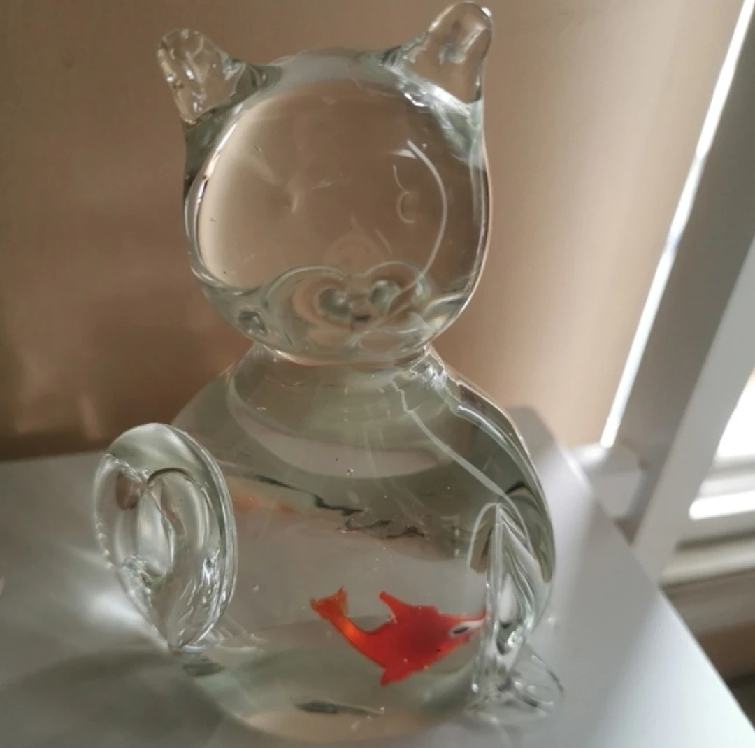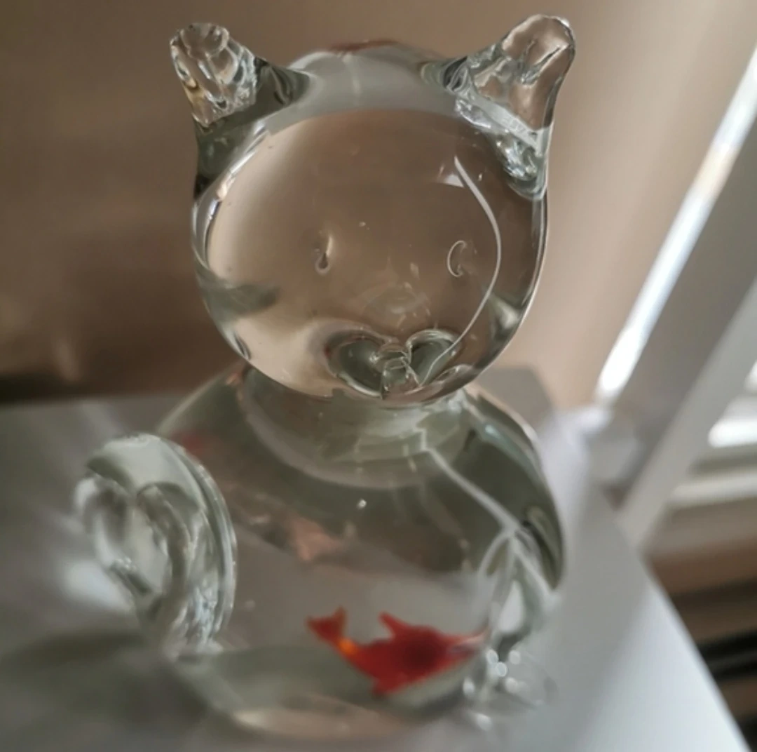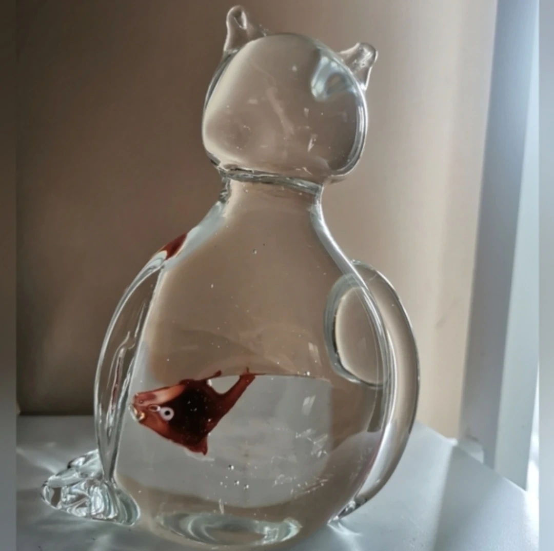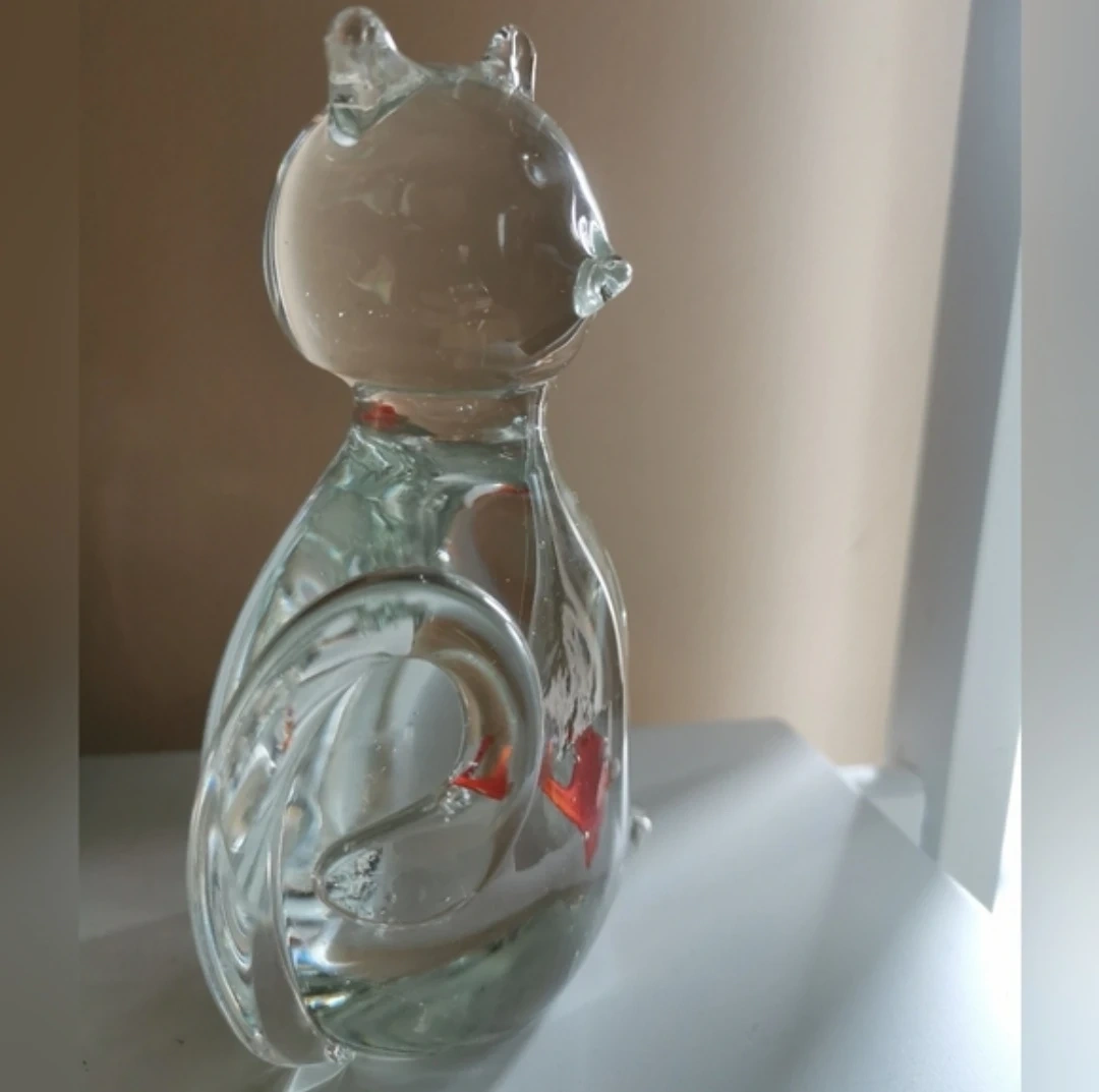 Murano glass cats with a fish inside all look different because they are handcrafted, and each piece is unique due to the variations in the glassblowing process. The handmade nature of Murano glass or Murano Style Glass ensures that even with the same design, there will be slight differences in form and color, making each piece a one-of-a-kind work of art. So two are never the same. The specific details, such as the size and position of the fish, the shape of the cat, or the presence of air bubbles, can all vary slightly from one piece to another. These variations are a sign of the handcrafted nature of the glass. Unfortunately doesn't have any stickers. In great vintage condition, heavy, about 5 inch tall.
