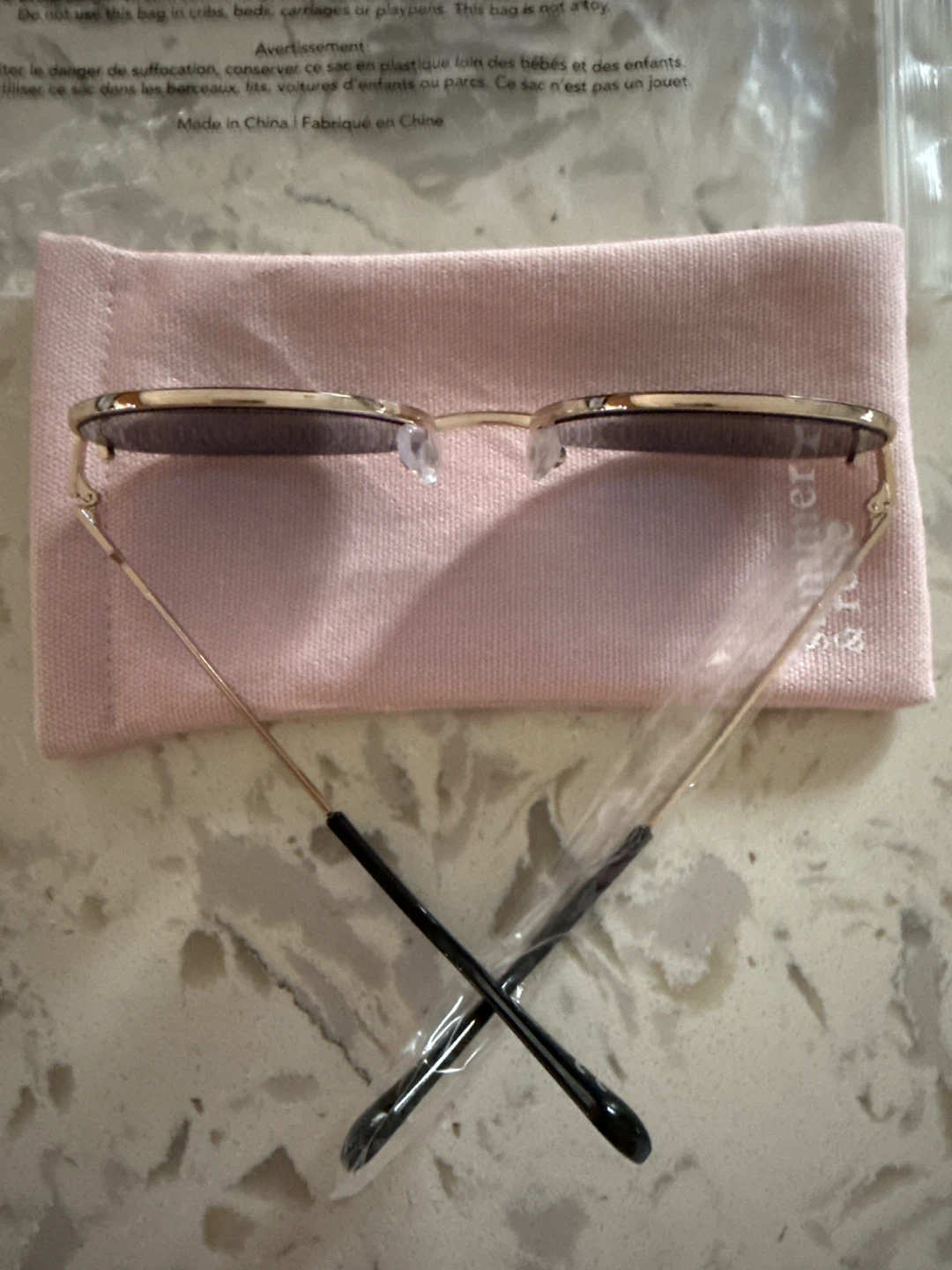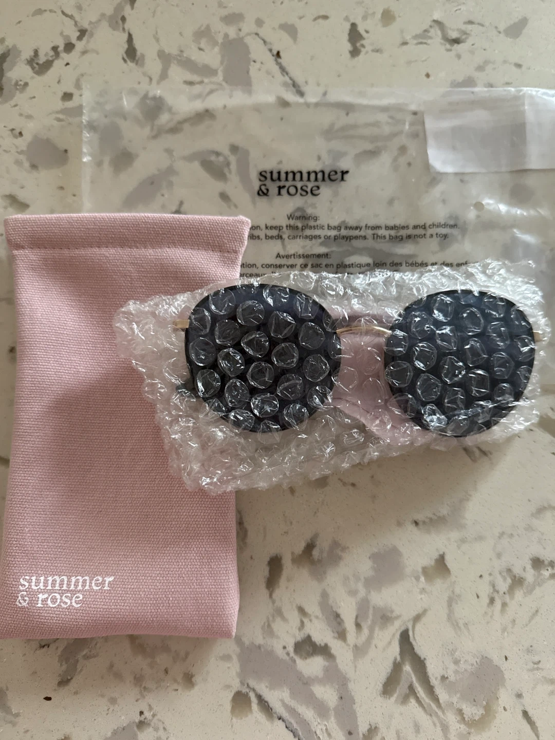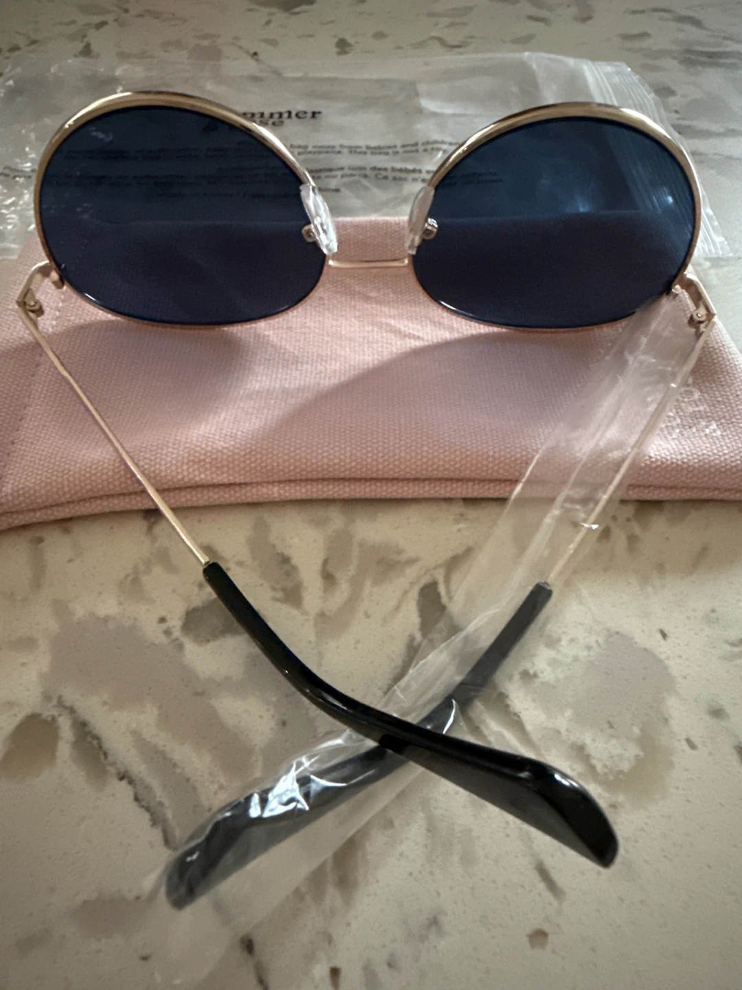 Summer & Rose round sunglasses with dark blue lenses and a gold-tone frame. It comes with a pink soft pouch for storage. These sunglasses offer UV protection for your eyes.