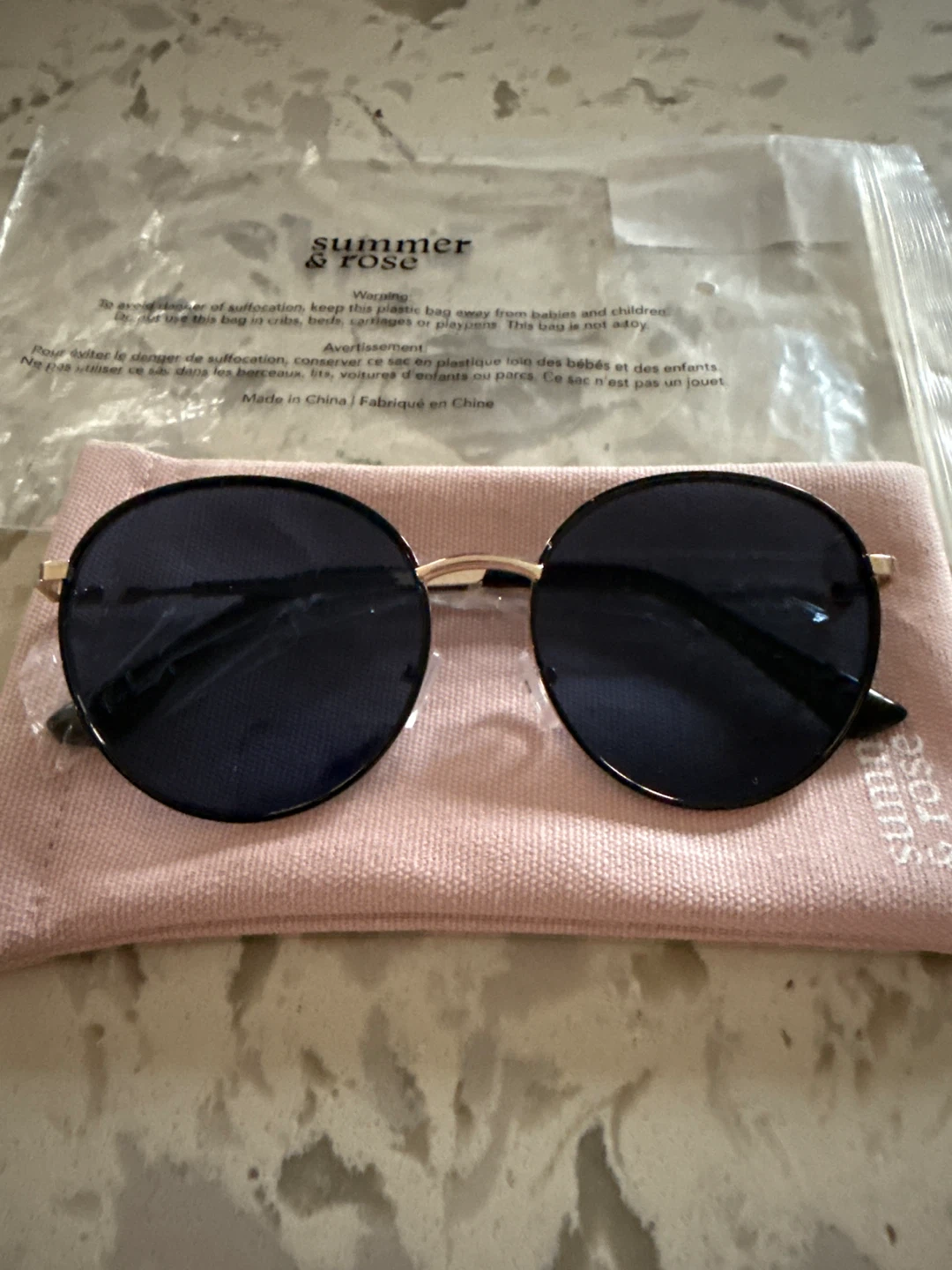 Summer & Rose round sunglasses with dark blue lenses and a gold-tone frame. It comes with a pink soft pouch for storage. These sunglasses offer UV protection for your eyes.