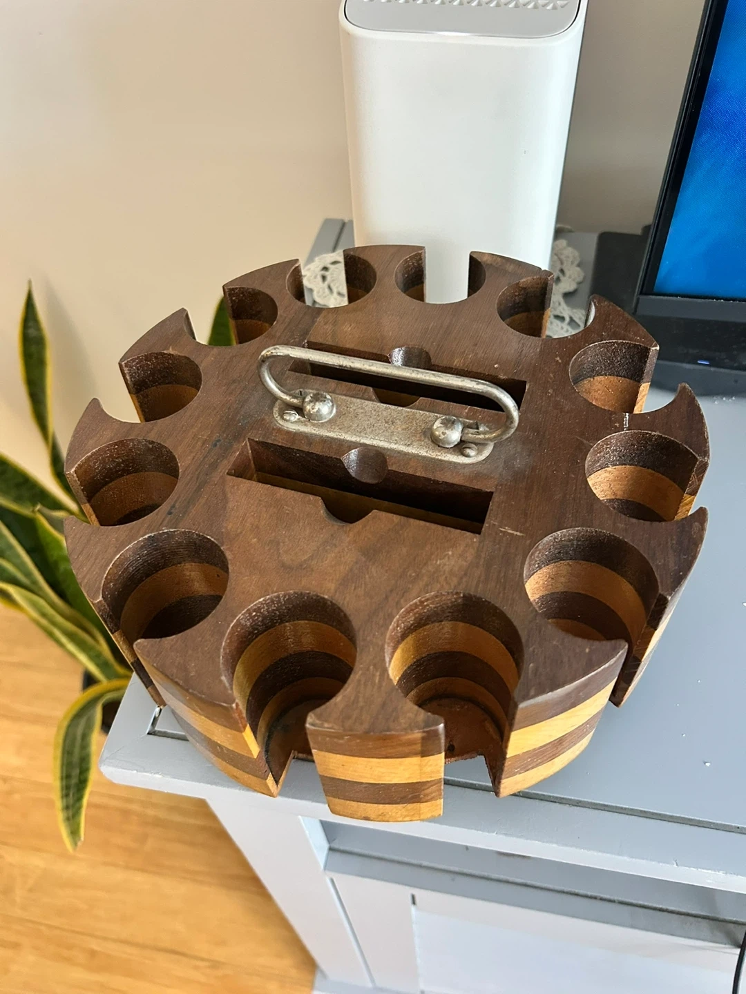 This vintage wooden poker chip holder has 12 individual slots for chips It features a metal handle for easy transport. The layered wood construction gives it distinct design and it’s on a turntable and spins.