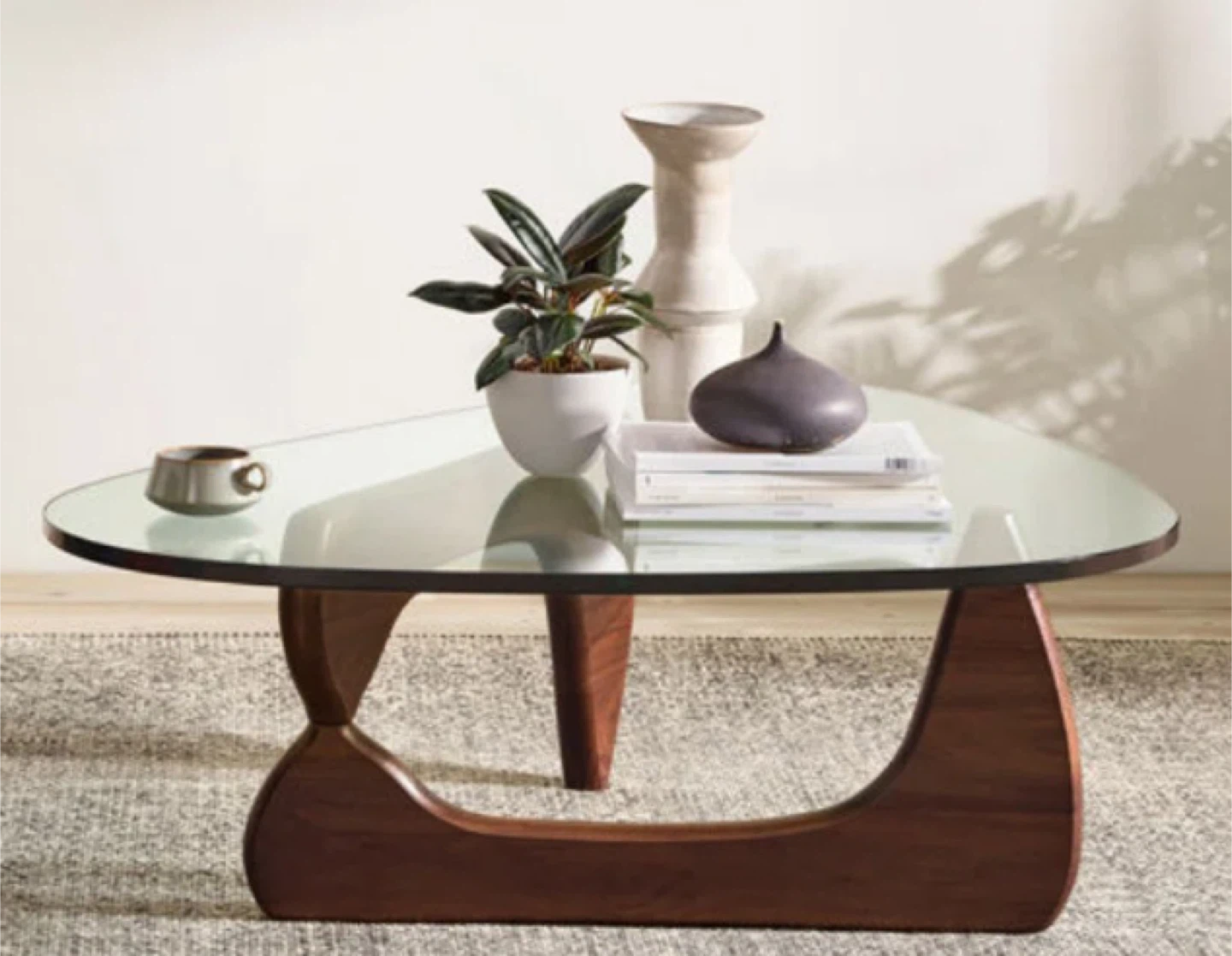 Mid-Century Triangle Glass Top Coffee Table with Wood Base