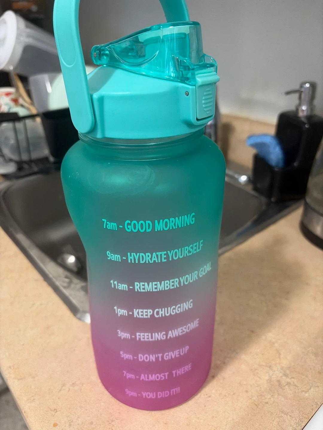 Stay hydrated with this fun gradient water bottle! It features motivational time markers to help you reach your daily hydration goals: