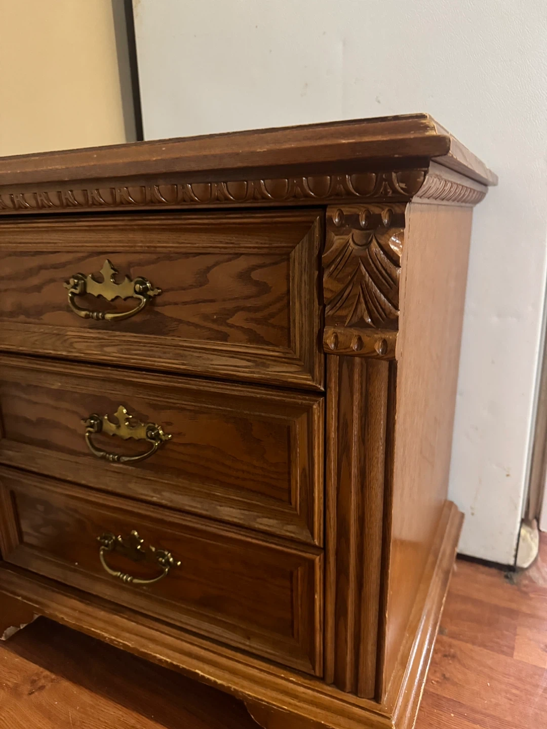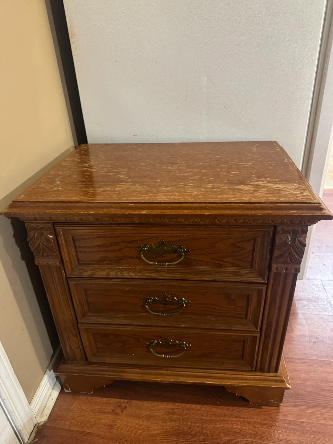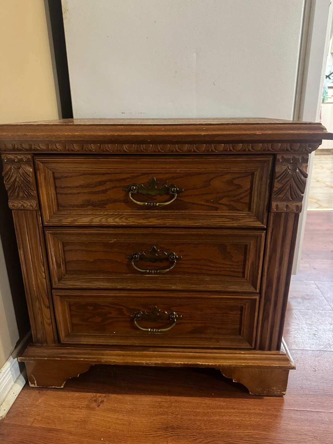 This is a solid wood nightstands with three drawers. It has decorative carved details and brass-toned hardware. The wood finish shows some wear, consistent with its age. It's a great size for a bedroom.