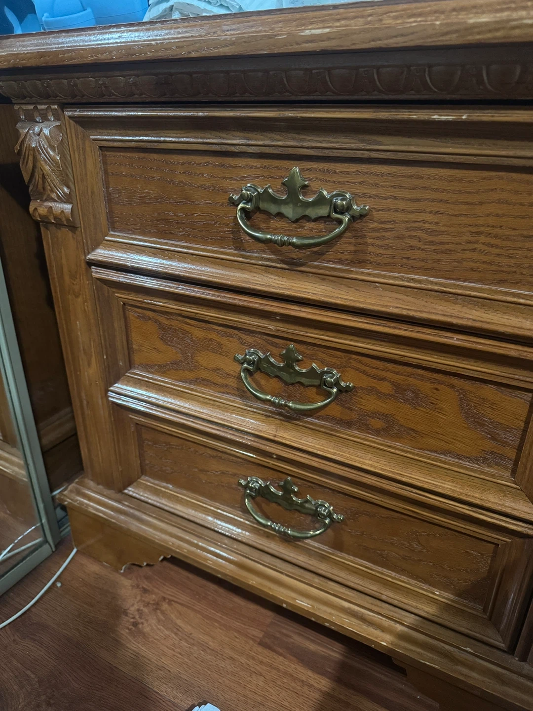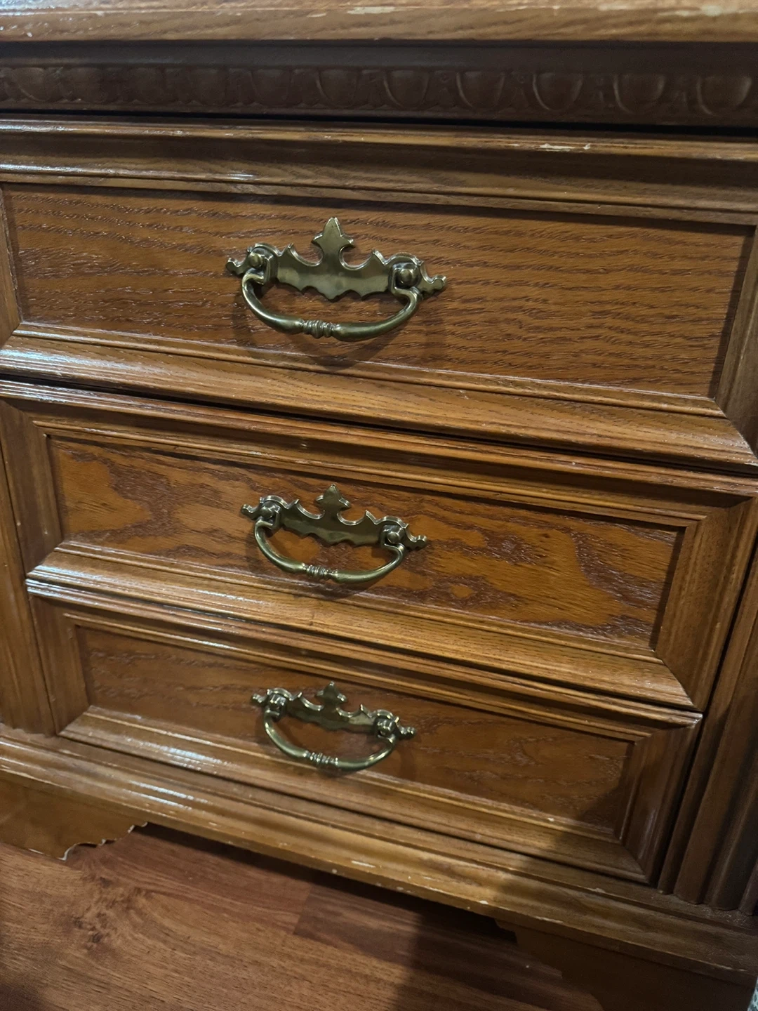 This is a solid wood nightstands with three drawers. It has decorative carved details and brass-toned hardware. The wood finish shows some wear, consistent with its age. It's a great size for a bedroom.