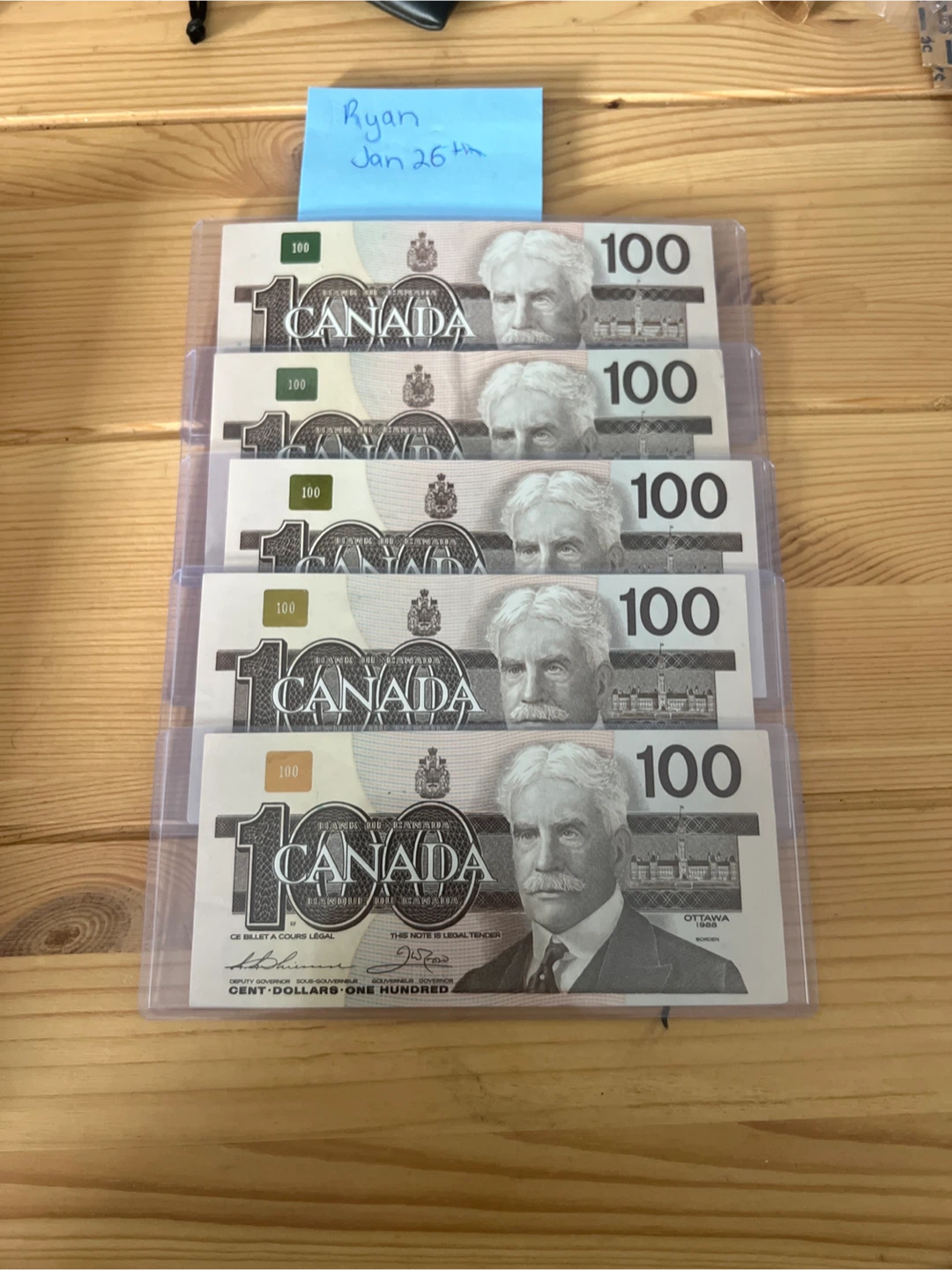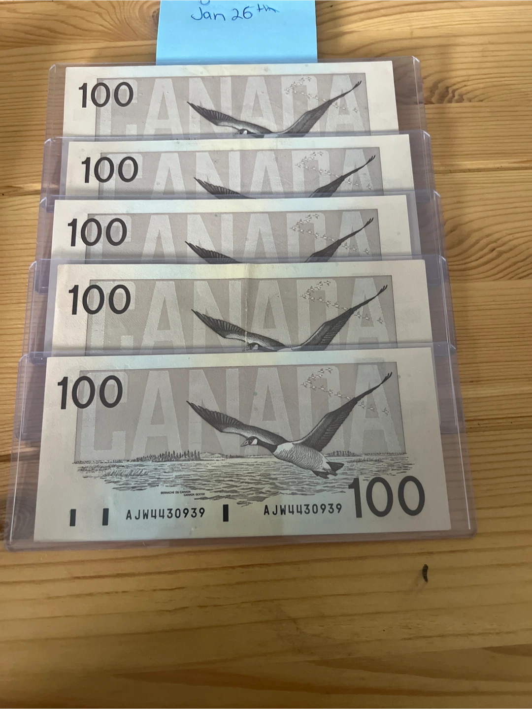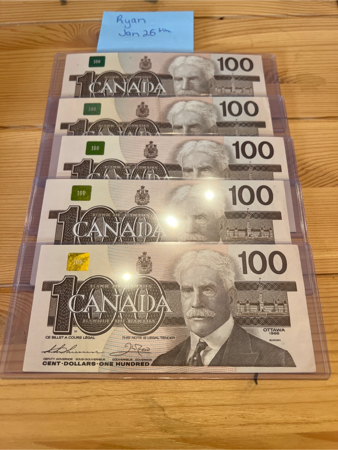 1988 Canadian 100$ bill. With a beautiful Canadian Goose on the back. They are in really good condition lightly circulated. They all come with a protective sleeve. 125$ each