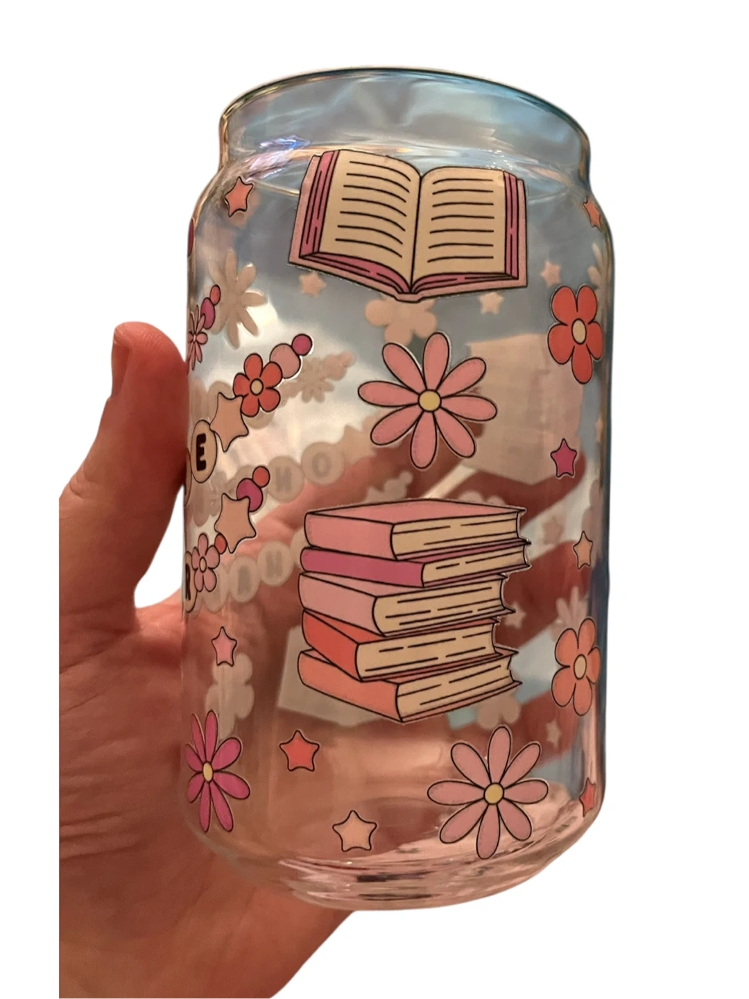 This cute glass can features a stack of books and says "Just One More Chapter". It's decorated with flowers and stars. Perfect for your morning coffee or iced tea!