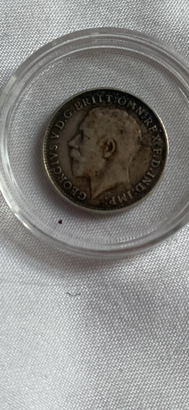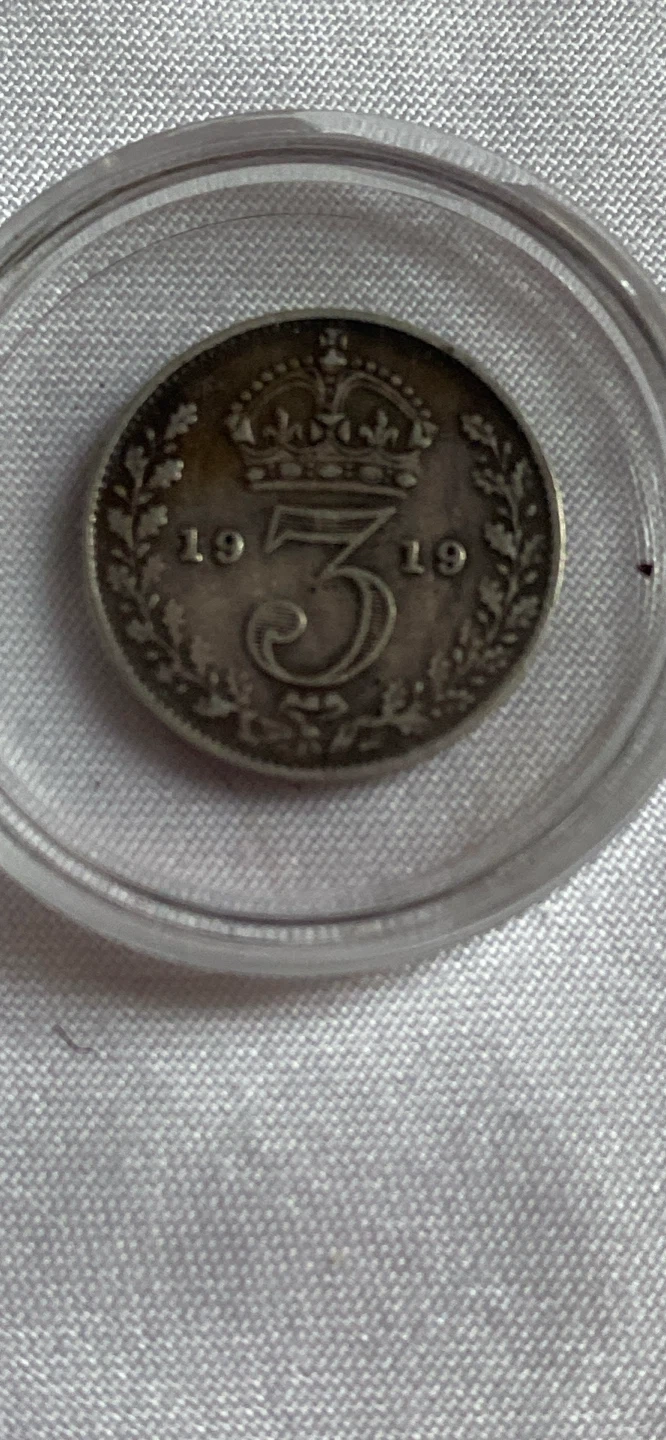 A British three pence coin from 1919. It features King George V on the obverse and a crowned numeral 3 on the reverse. This coin is a neat piece of history.