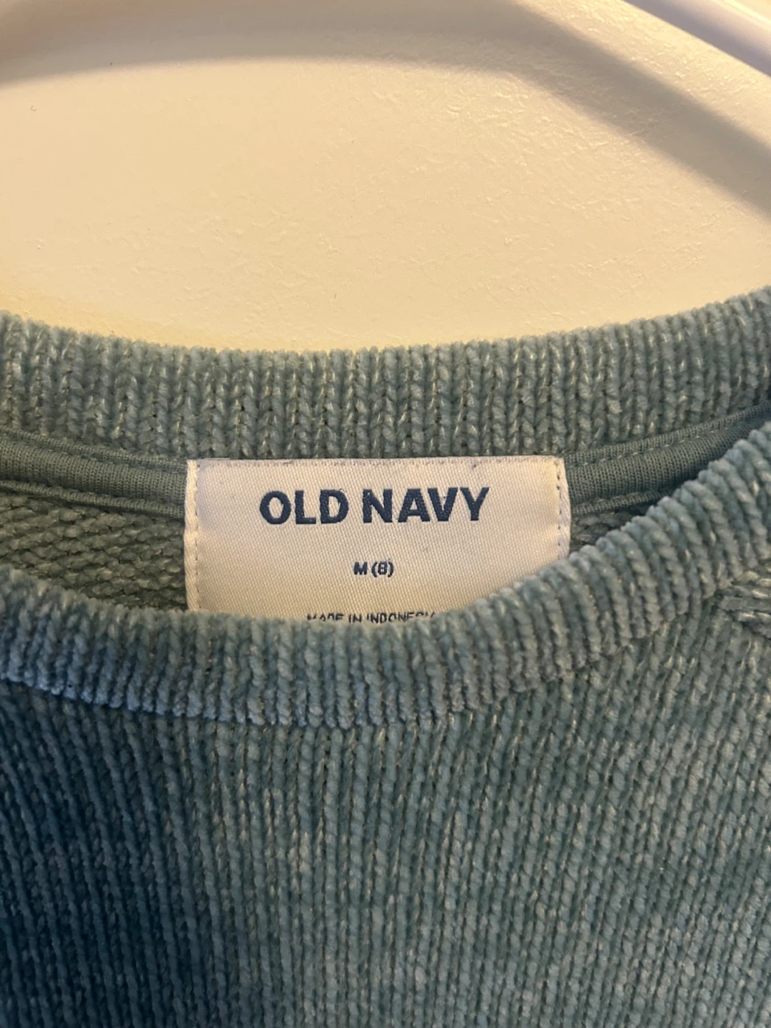 This Old Navy crew neck sweater is a size medium, which fits an 8-year-old. It's made of a soft, ribbed material. A cozy addition to any kid's wardrobe for cooler days!