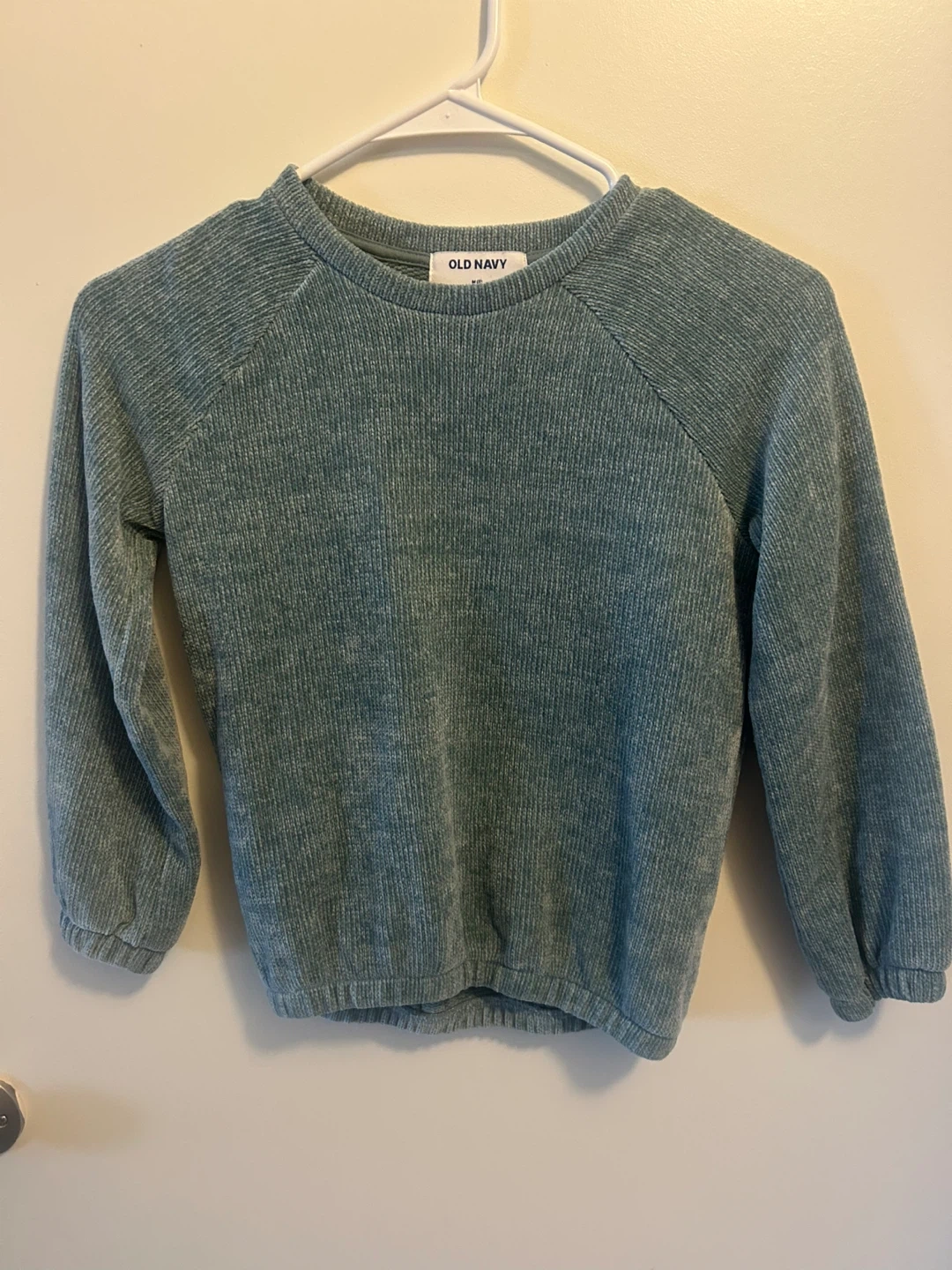 This Old Navy crew neck sweater is a size medium, which fits an 8-year-old. It's made of a soft, ribbed material. A cozy addition to any kid's wardrobe for cooler days!