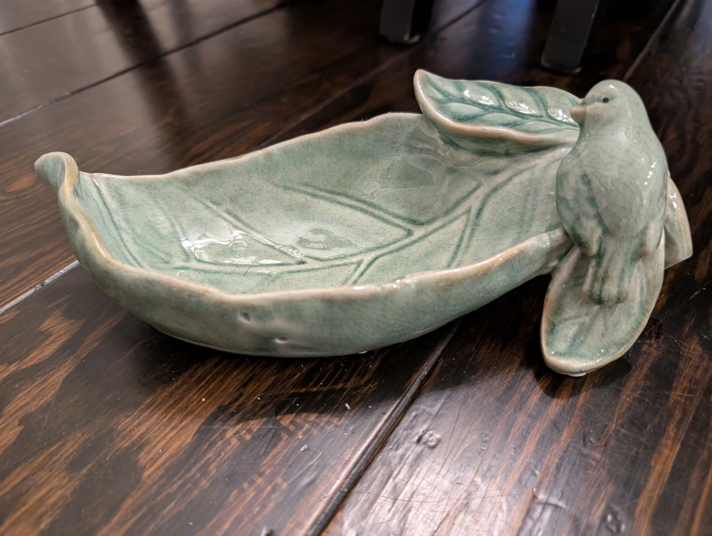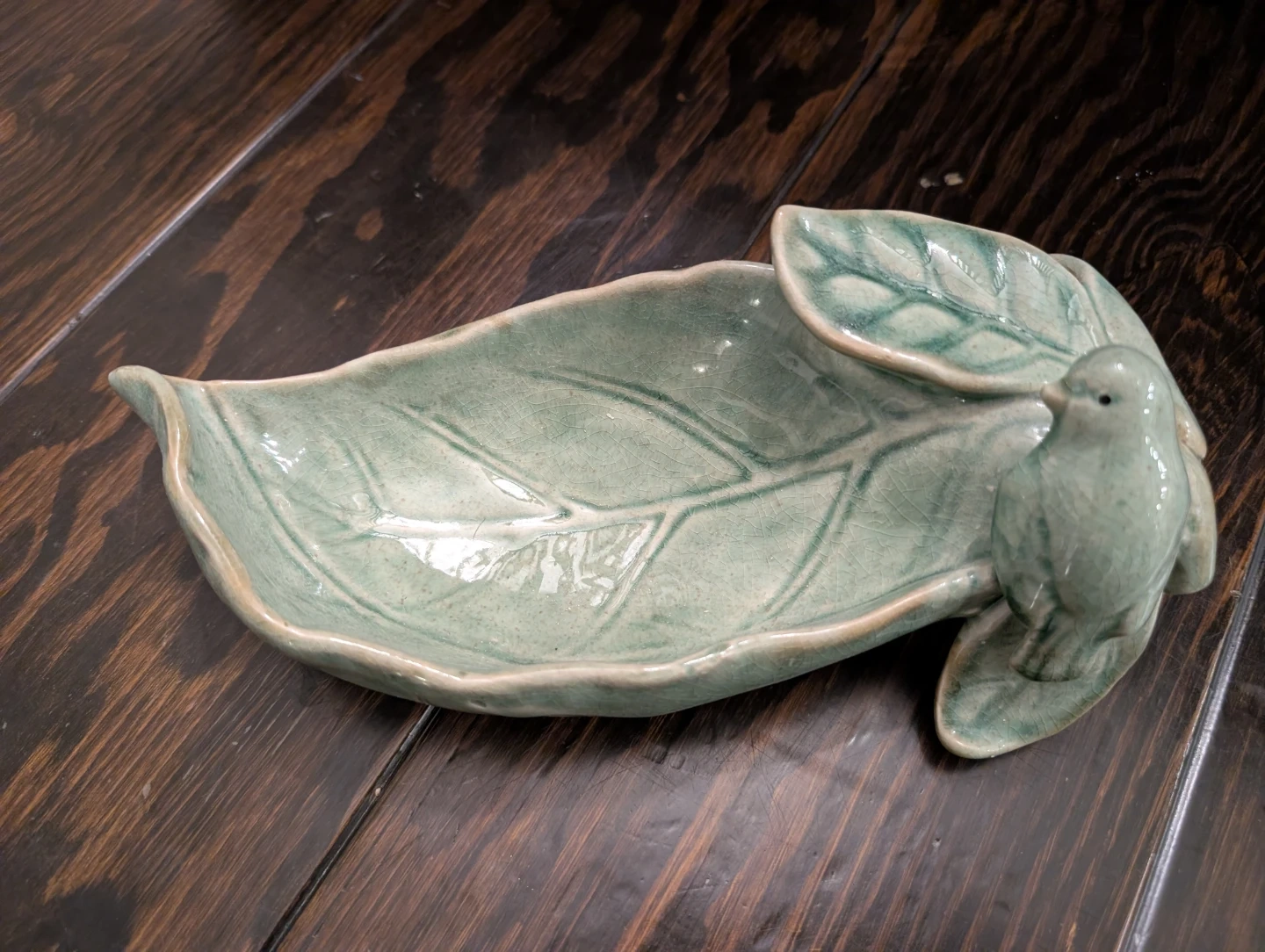 This decorative dish is shaped like a leaf with a little bird accent. It's perfect for holding small jewellery or keys. Ceramic material.