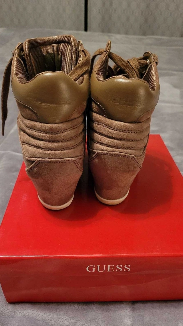 Step up your shoe game with these stylish Guess wedge sneakers in size 8. These fashionable sneakers feature a hidden wedge heel, offering a blend of comfort and style. They've been worn, so they aren't new but they're still in good condition. Very comfortable and clean! Here are some details: Brand: Guess, Size: 8, Style: Wedge Sneakers, Colour: Brown. Looking to add a little height without sacrificing comfort? These Guess sneakers are perfect. If you're seeing this ad, the sneakers are still available for purchase! Pick up in Rockwood, On. Cash accepted.