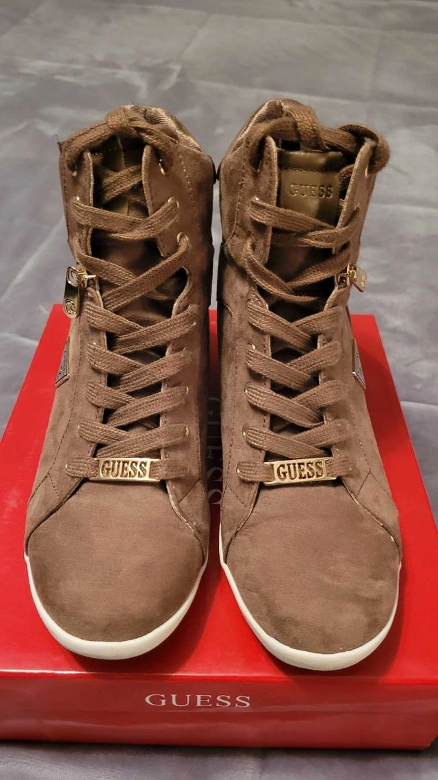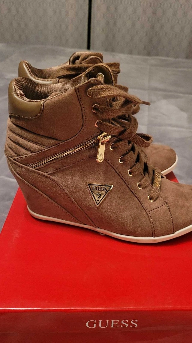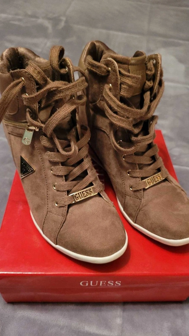 Step up your shoe game with these stylish Guess wedge sneakers in size 8. These fashionable sneakers feature a hidden wedge heel, offering a blend of comfort and style. They've been worn, so they aren't new but they're still in good condition. Very comfortable and clean! Here are some details: Brand: Guess, Size: 8, Style: Wedge Sneakers, Colour: Brown. Looking to add a little height without sacrificing comfort? These Guess sneakers are perfect. If you're seeing this ad, the sneakers are still available for purchase! Pick up in Rockwood, On. Cash accepted.