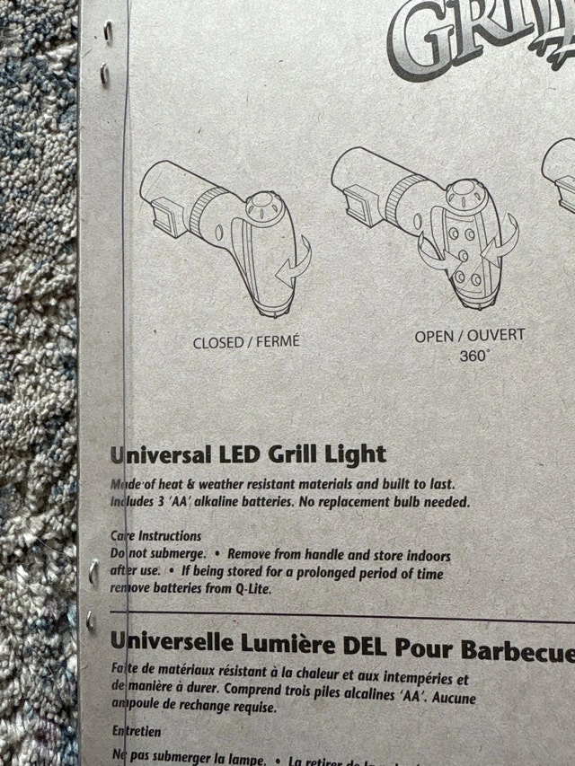 Illuminate your grilling experience with this Grill Life universal LED grill light, brand new in packaging! The light is made of heat and weather resistant materials and built to last. It includes three 'AA' alkaline batteries and no replacement bulb is needed. It attaches to most barbecue handles, the light swivels 360 degrees, and the body rotates 360 degrees. Cash accepted.