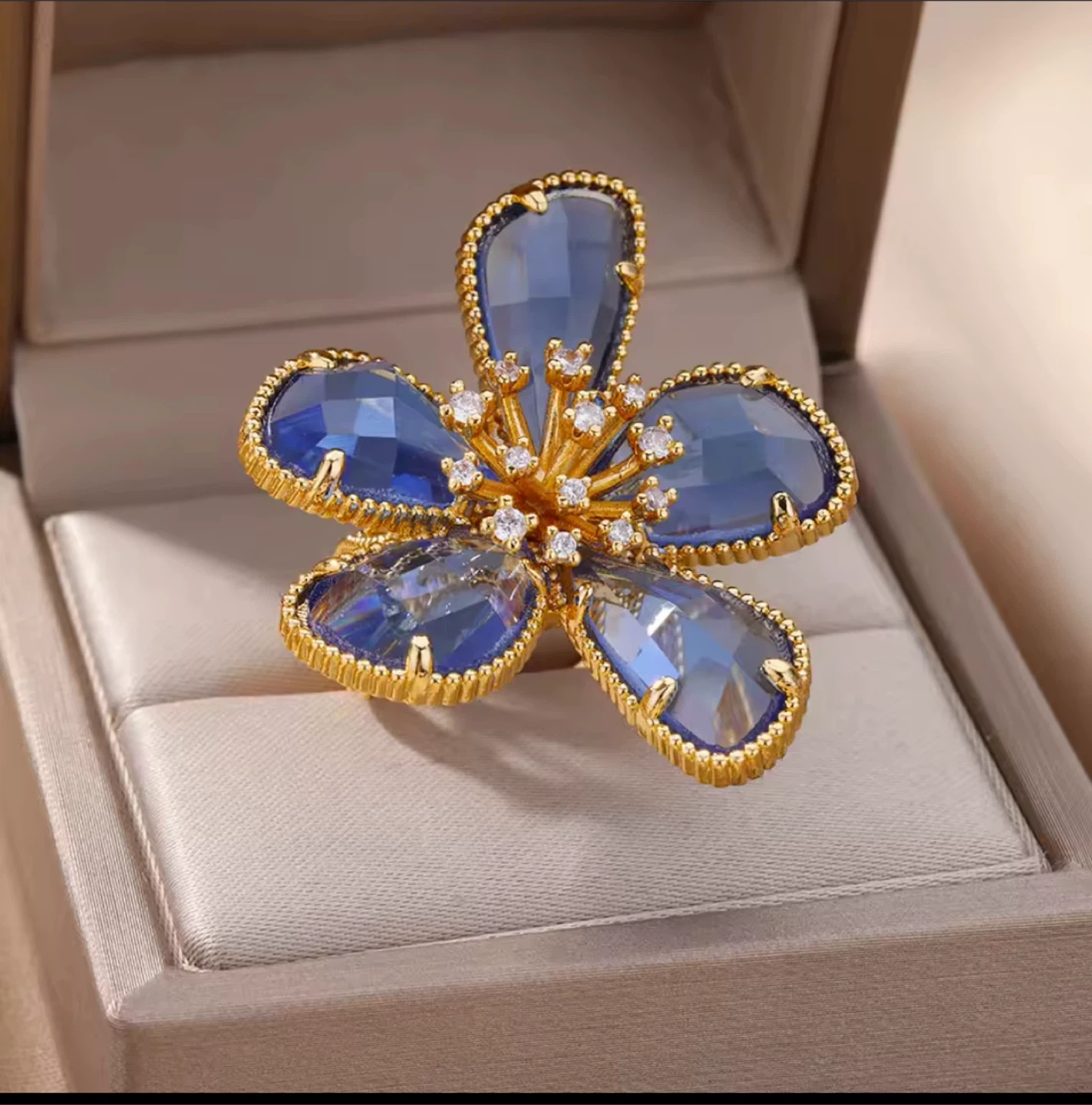 Beautiful blue flower ring with gold detailing. It's in great condition and would make a lovely addition to any jewelry collection