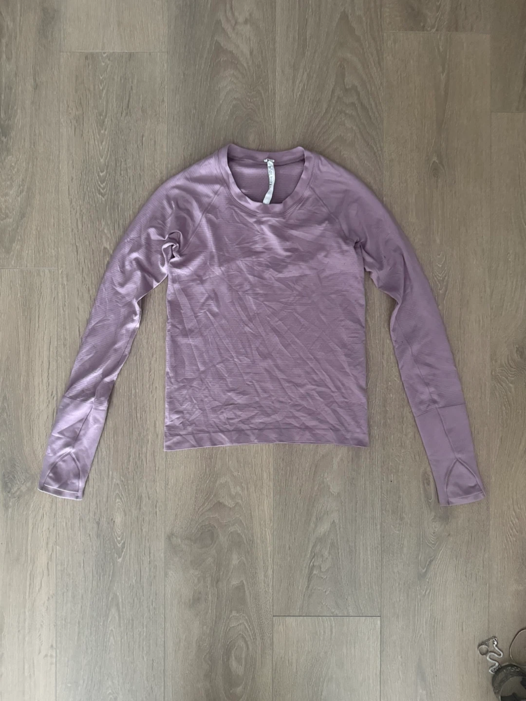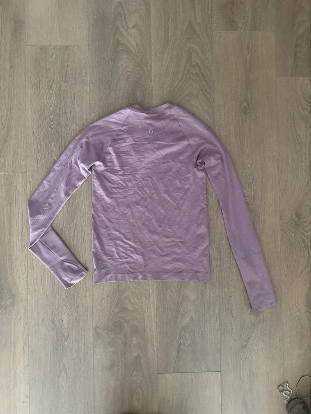 This Lululemon long sleeve top is a size 4. It's a pale lilac colour with a textured pattern. Thumbholes are included in the sleeves. Only worn a few times, Im selling since Im a student! I do discounts on bundles!!