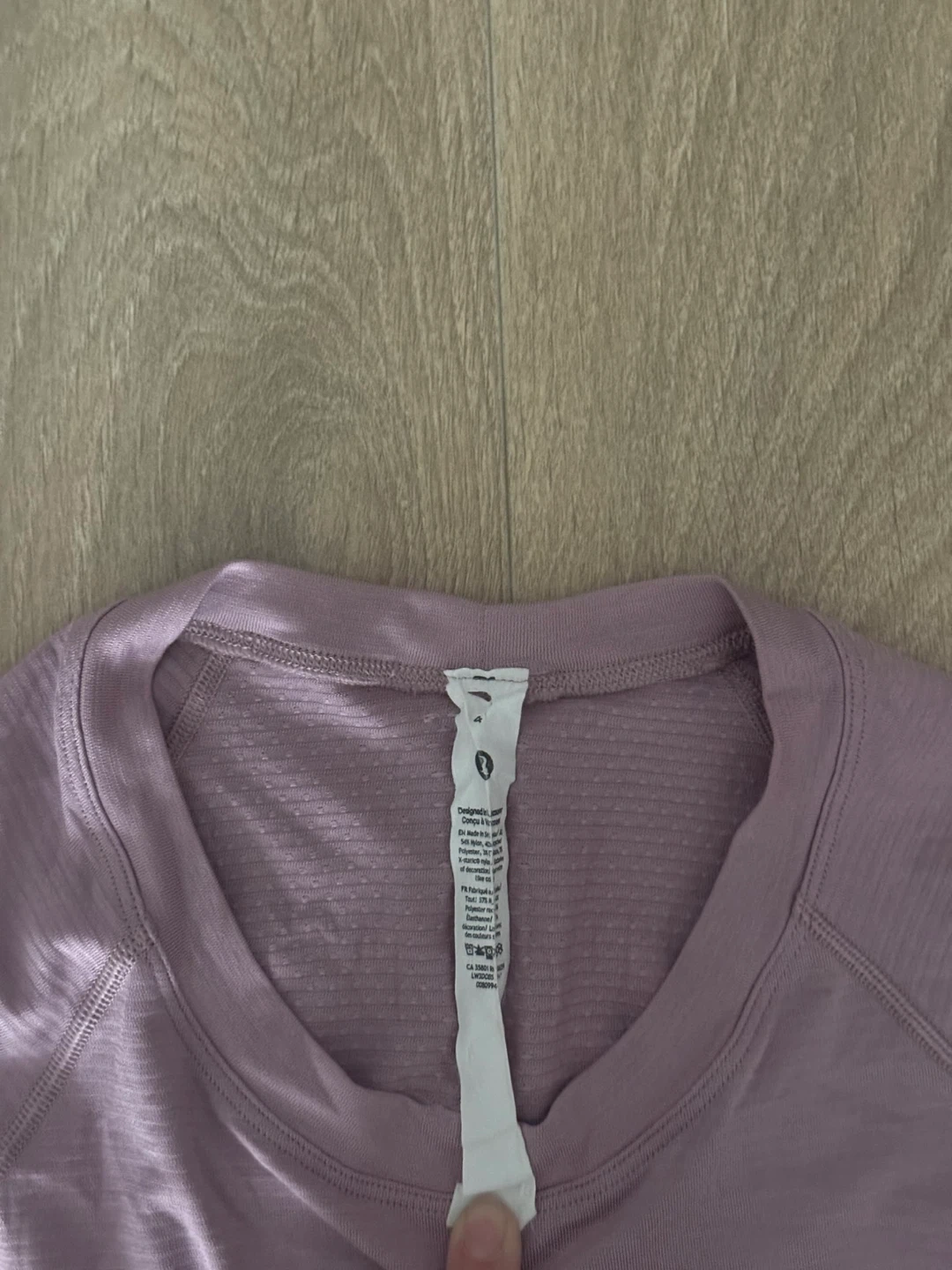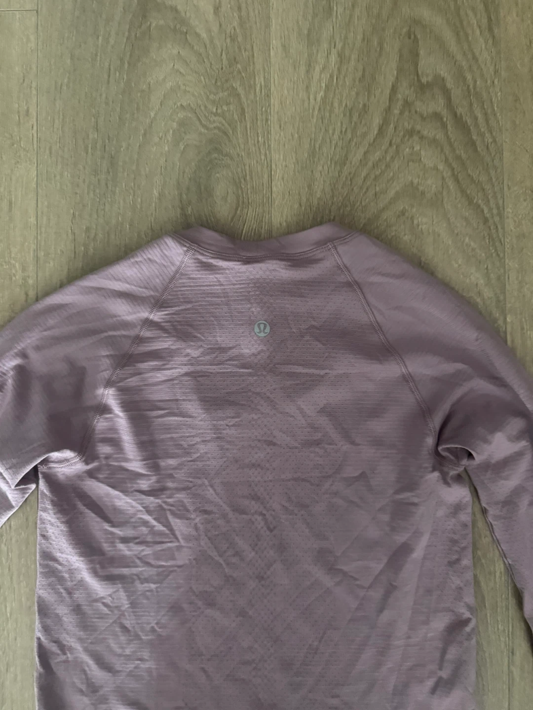 This Lululemon long sleeve top is a size 4. It's a pale lilac colour with a textured pattern. Thumbholes are included in the sleeves. Only worn a few times, Im selling since Im a student! I do discounts on bundles!!