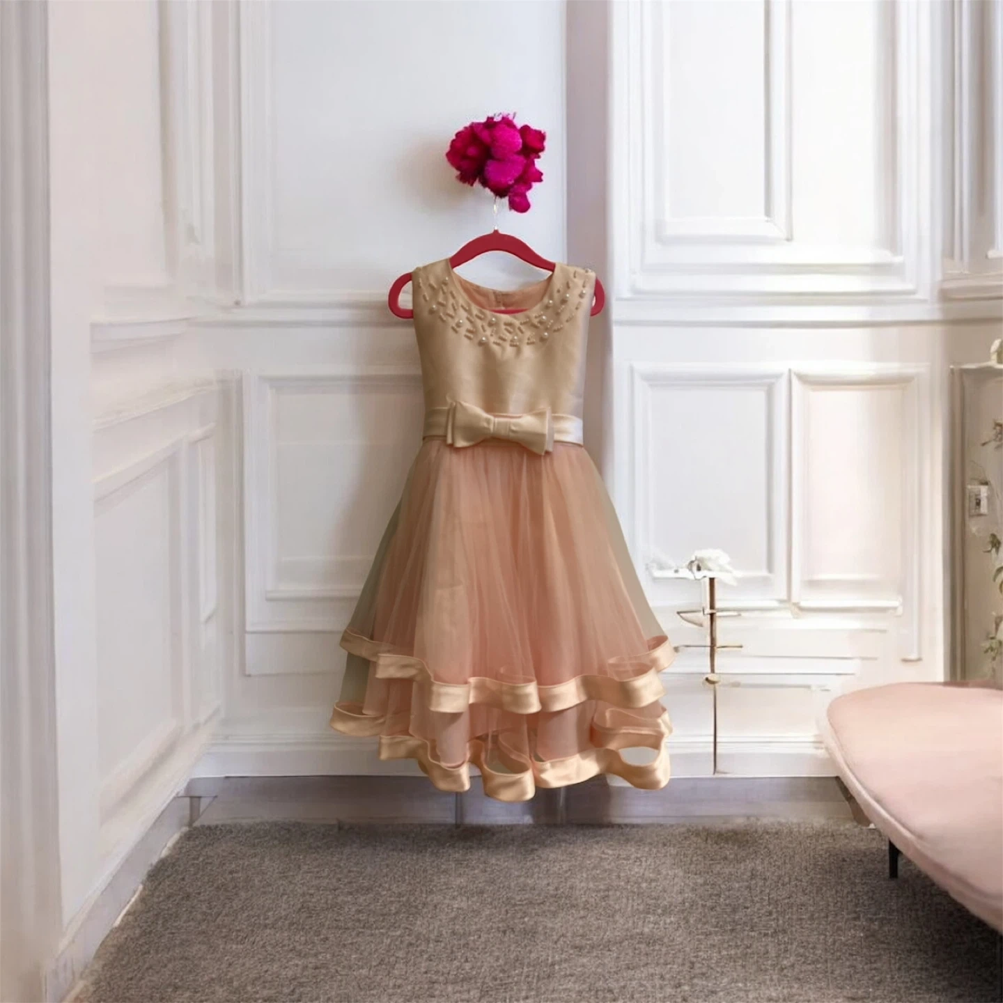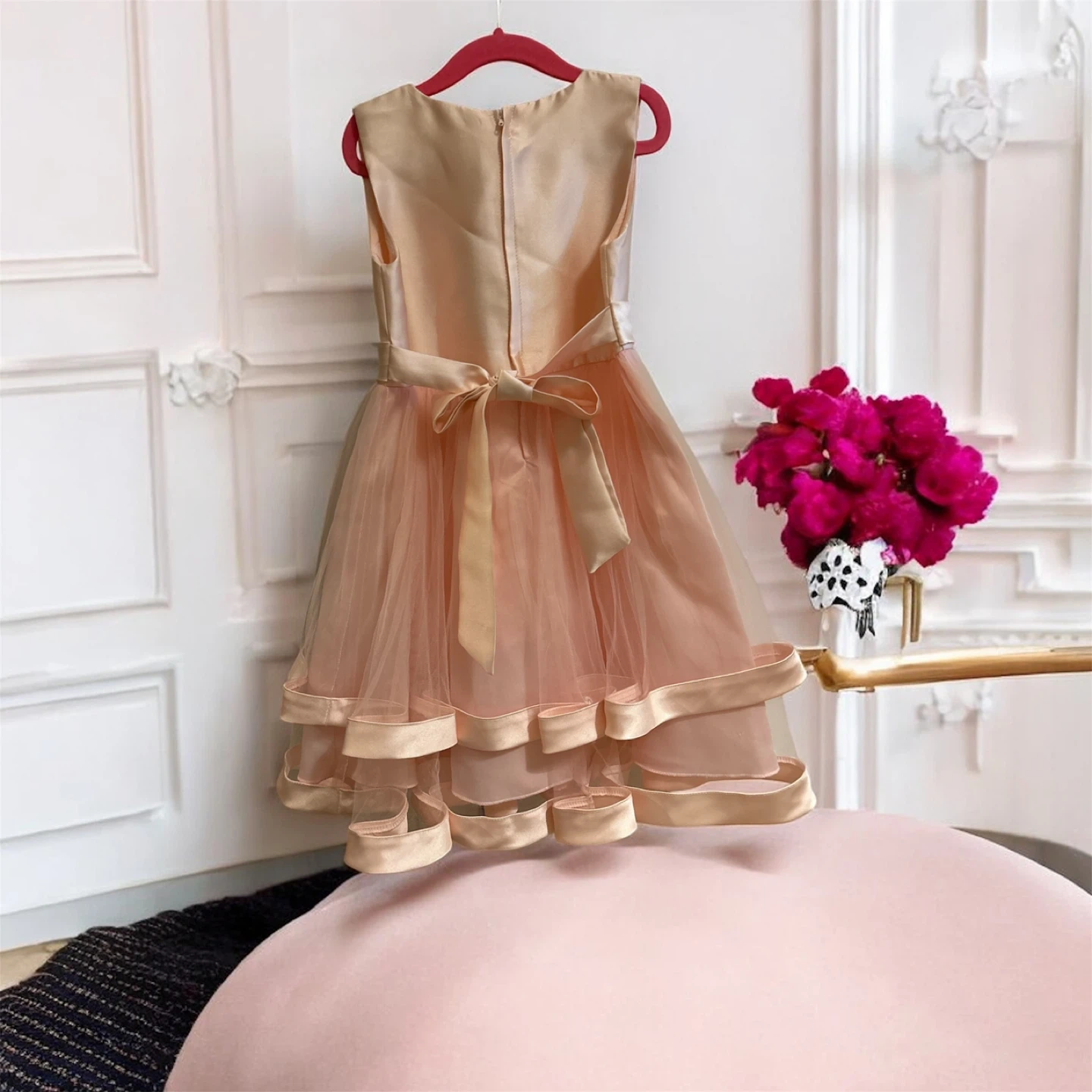A beautiful dress for a special occasion! It's a lovely pink colour with a tulle skirt and ribbon details and beautiful beading around the neck. Perfect for a party or any fancy event. Size 5Y.