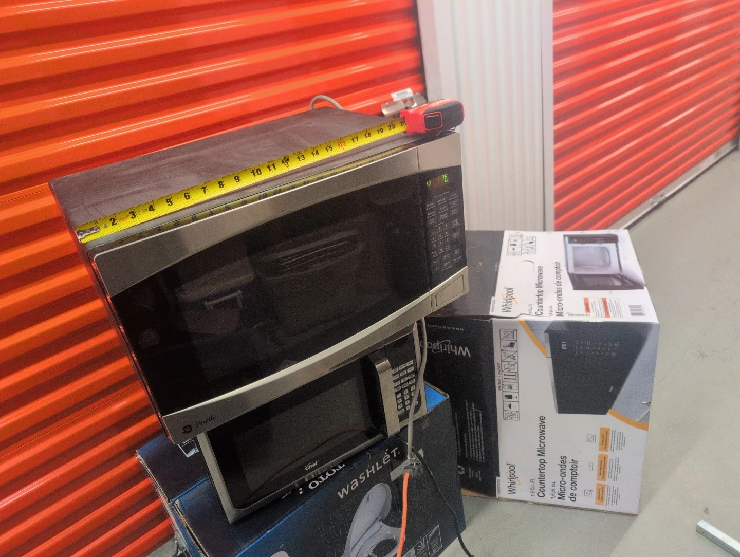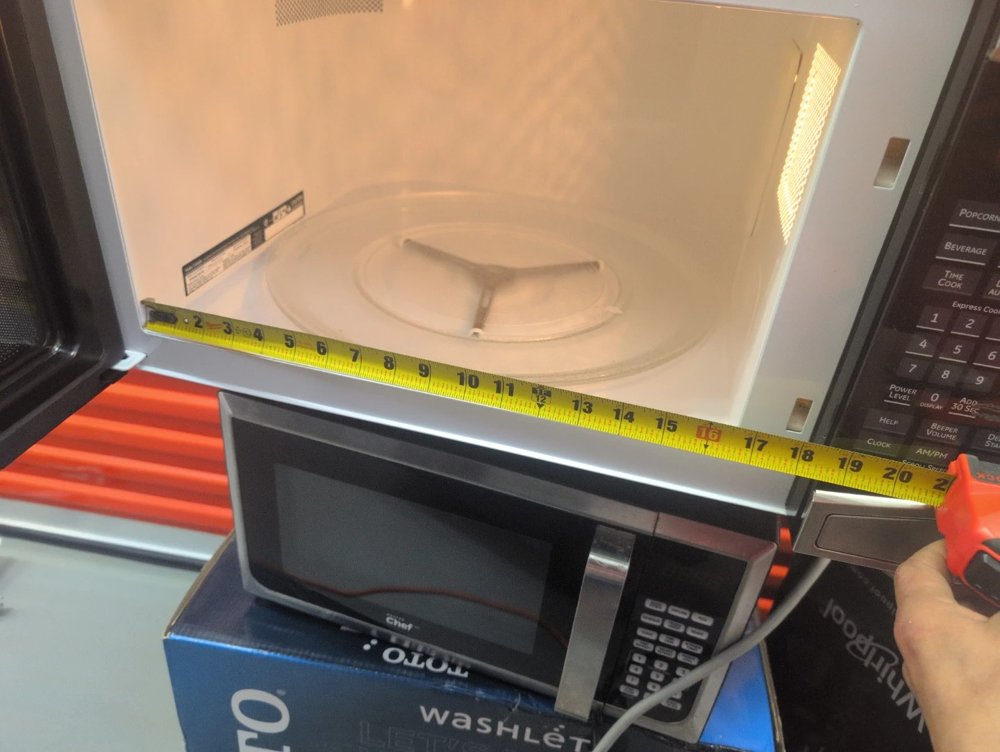 Whirlpool countertop microwave with 1.6 cu. ft. capacity. Includes one-touch sensor cooking and express cook options. Interior measures approximately 15 inches wide by 9 inches high.
