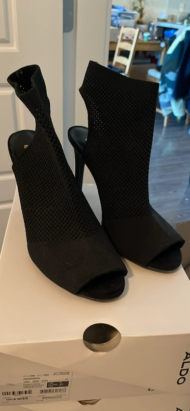 These are a pair of open toe booties in black, size 9. They're in good condition and ready for a new owner! The box is included.