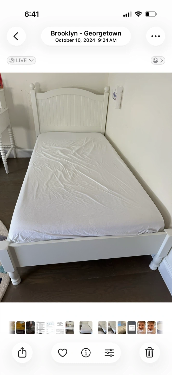 White twin bed frame with a beadboard headboard and spindle legs. It's made of wood. A matching white desk with drawers is also available. Including mattress Crate&Barrel