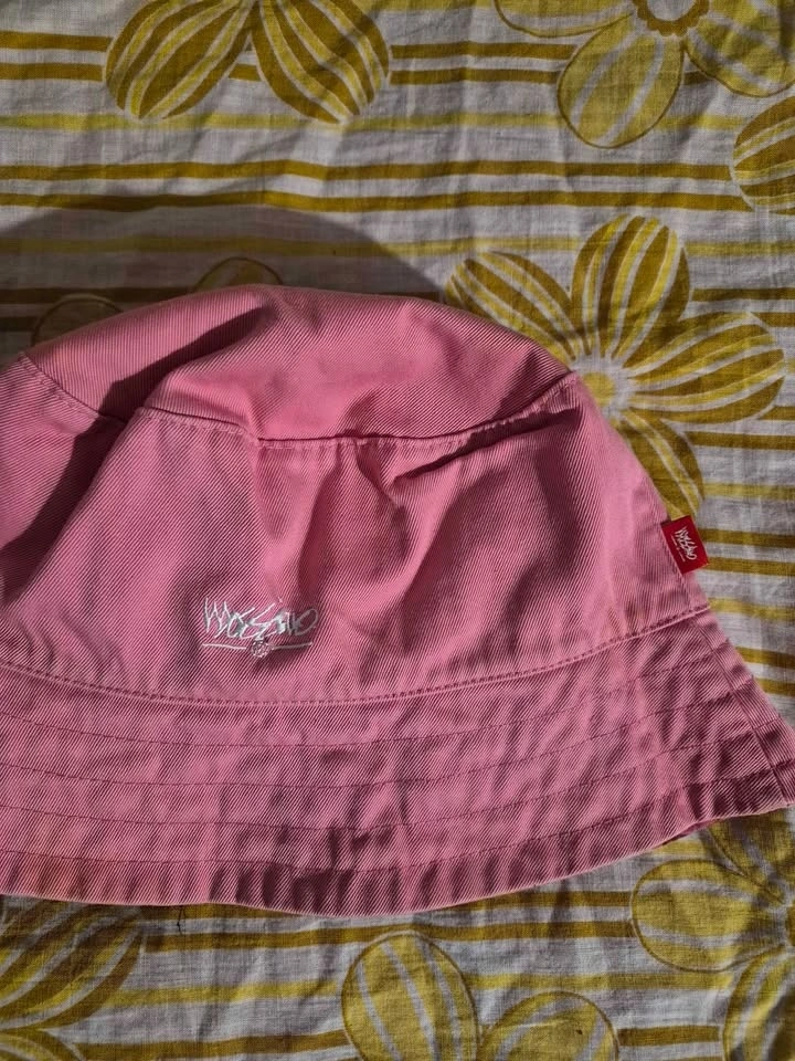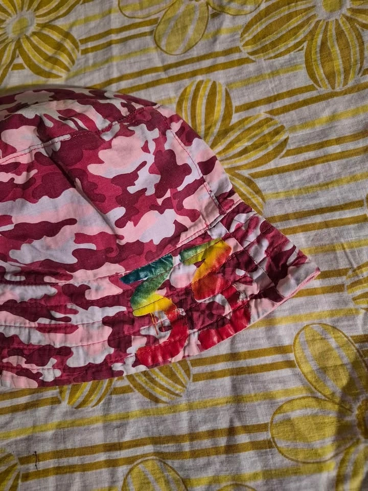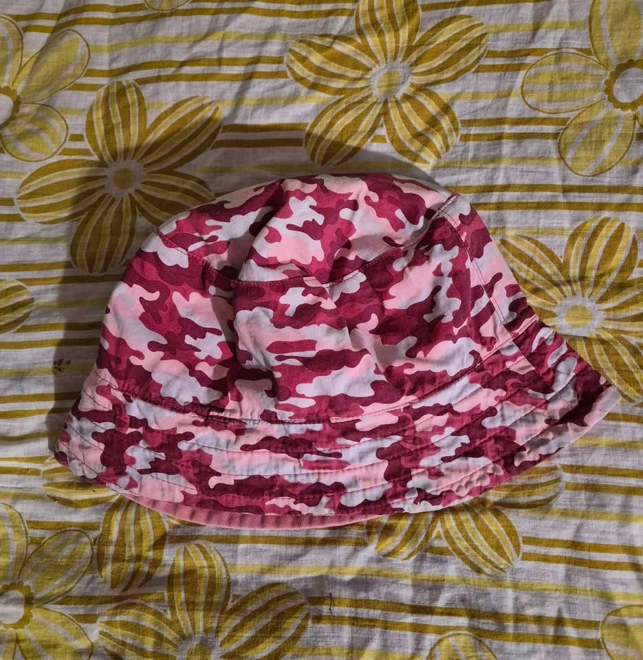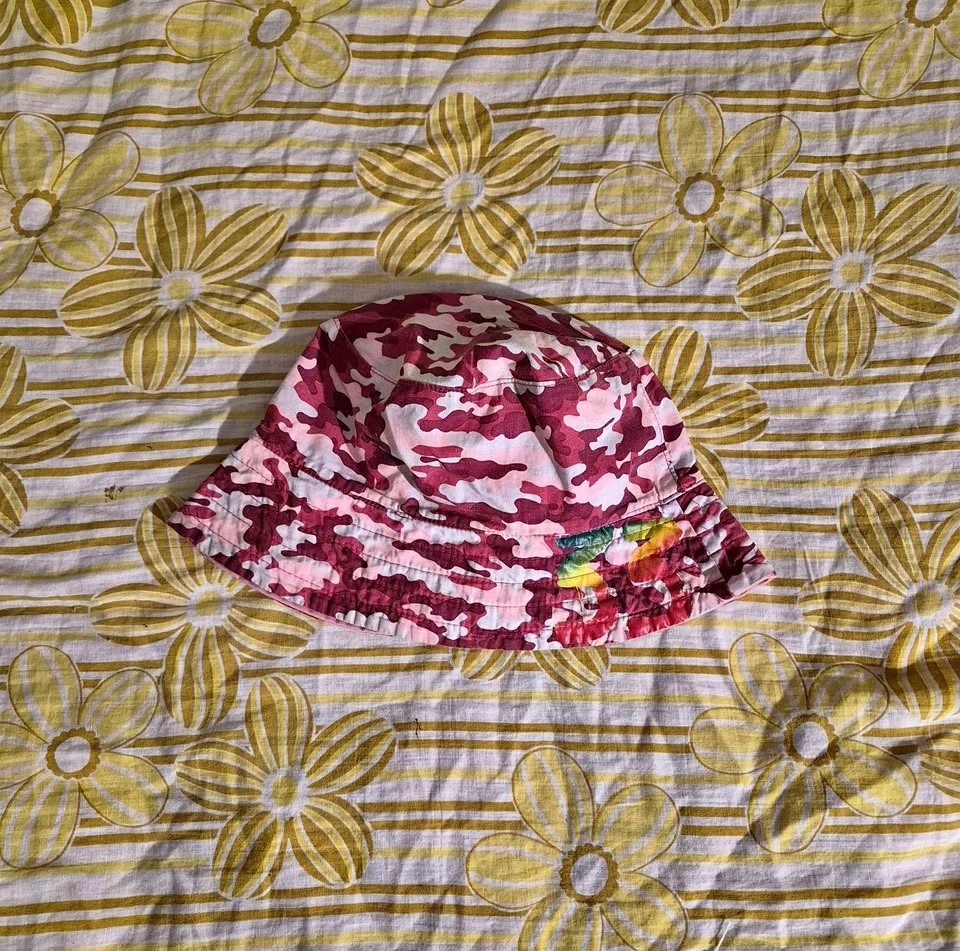 2000s reversible pink camouflage bucket hat by Mossimo. One side is plain pink with a white logo and red tag, the other side has pink camouflage with a rainbow number '23'. One size, approximately 10in across and just under 8in top to bottom. Item is in good used condition with no visible flaws or stains.