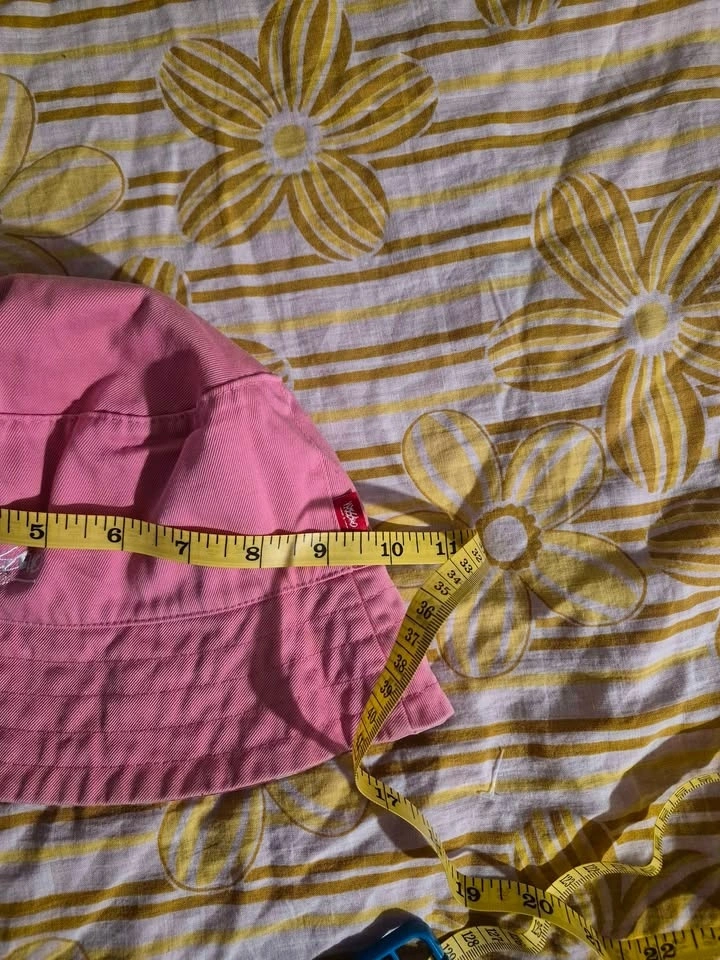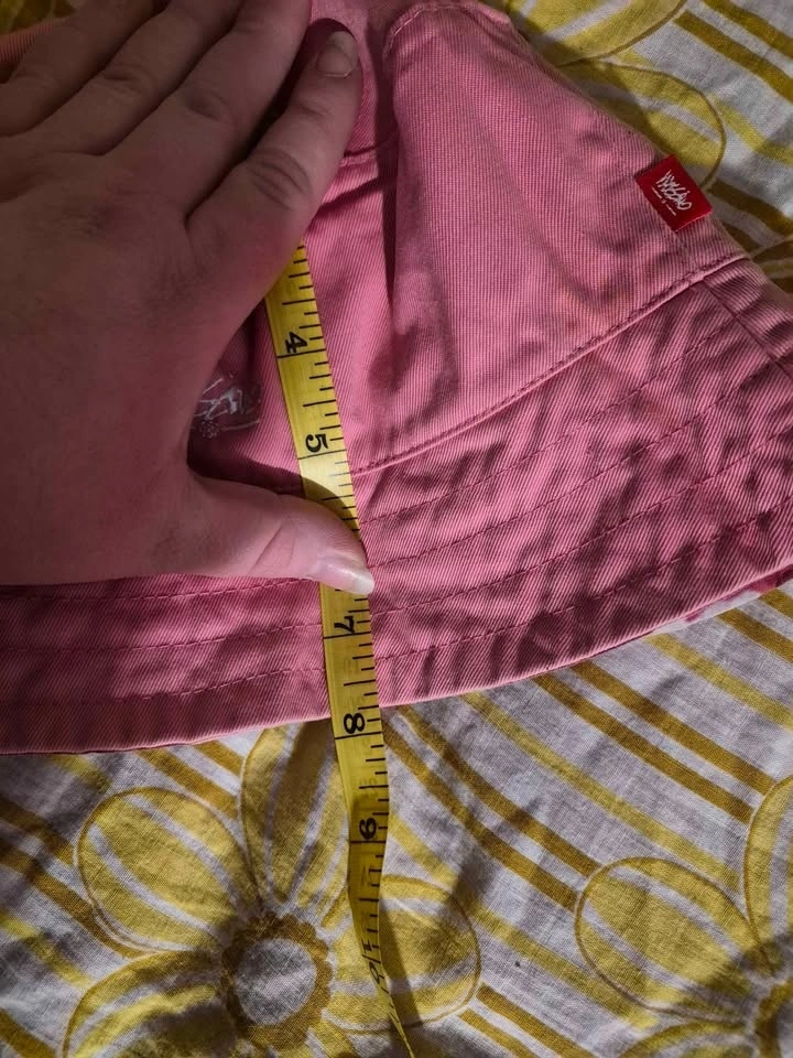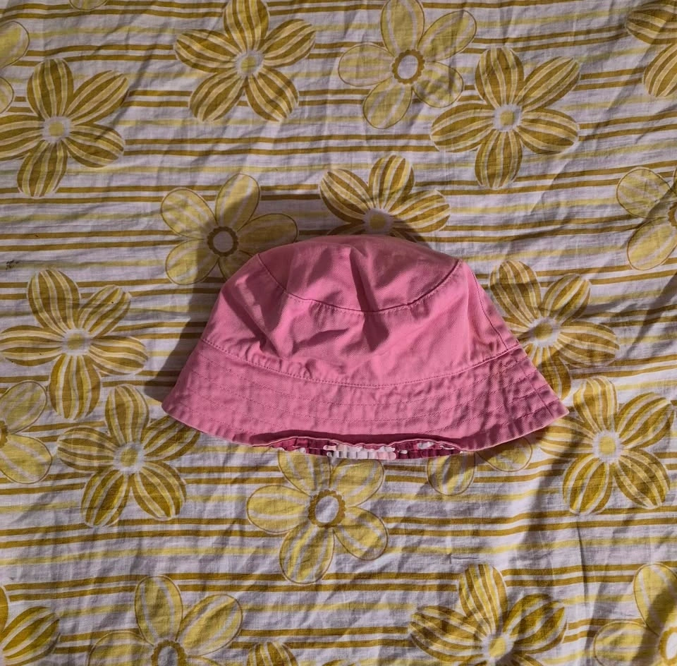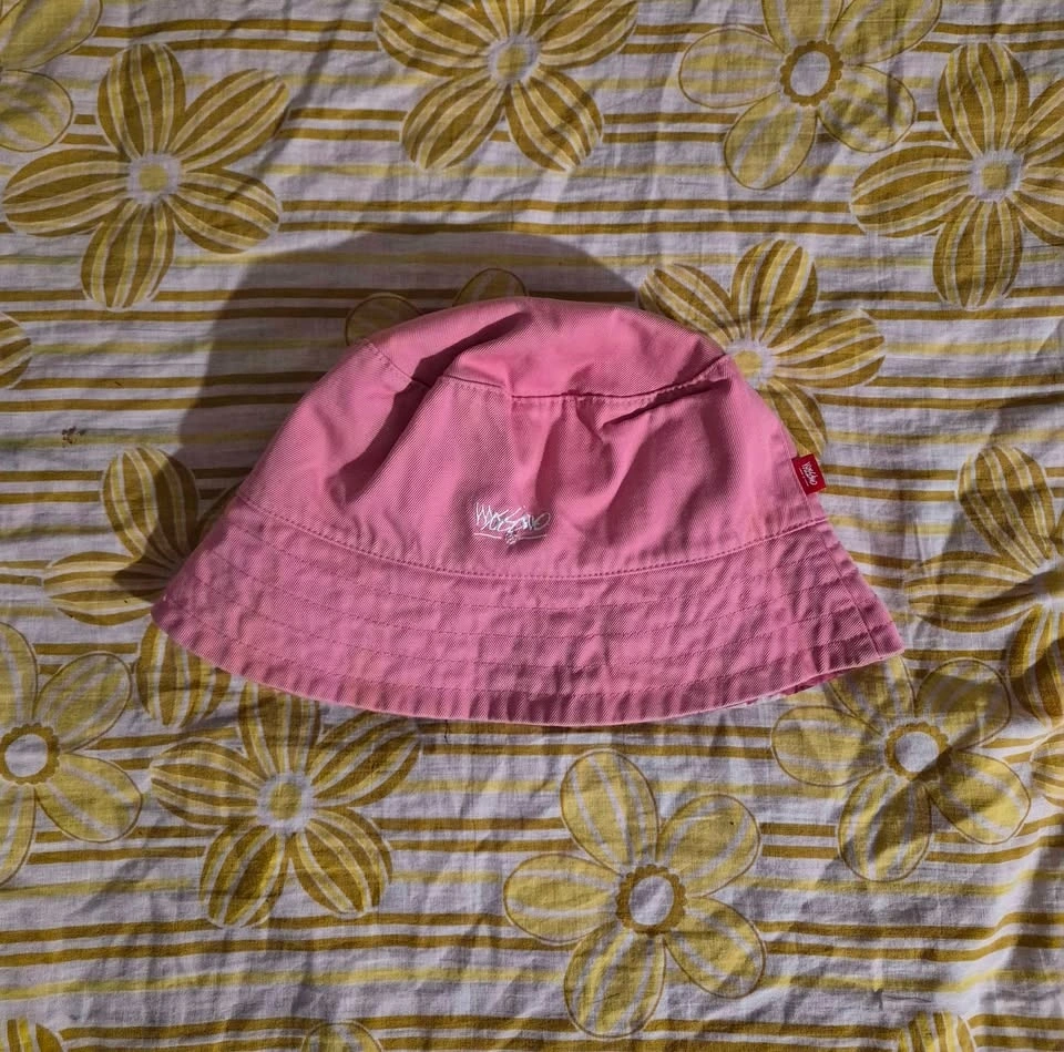 2000s reversible pink camouflage bucket hat by Mossimo. One side is plain pink with a white logo and red tag, the other side has pink camouflage with a rainbow number '23'. One size, approximately 10in across and just under 8in top to bottom. Item is in good used condition with no visible flaws or stains.