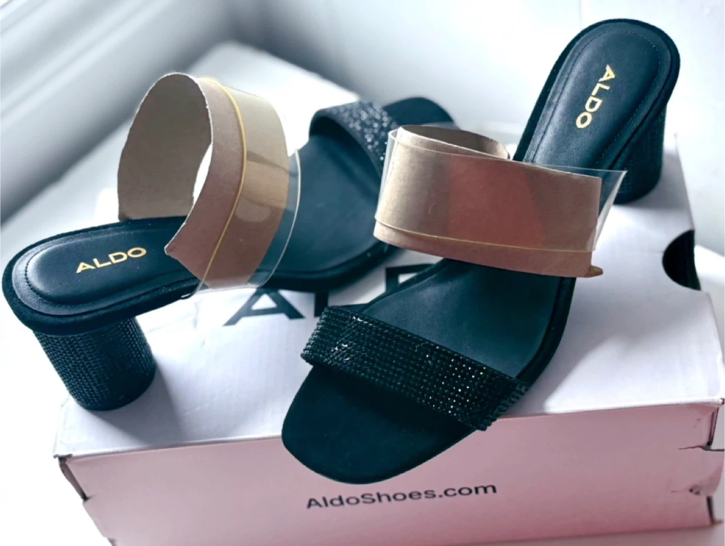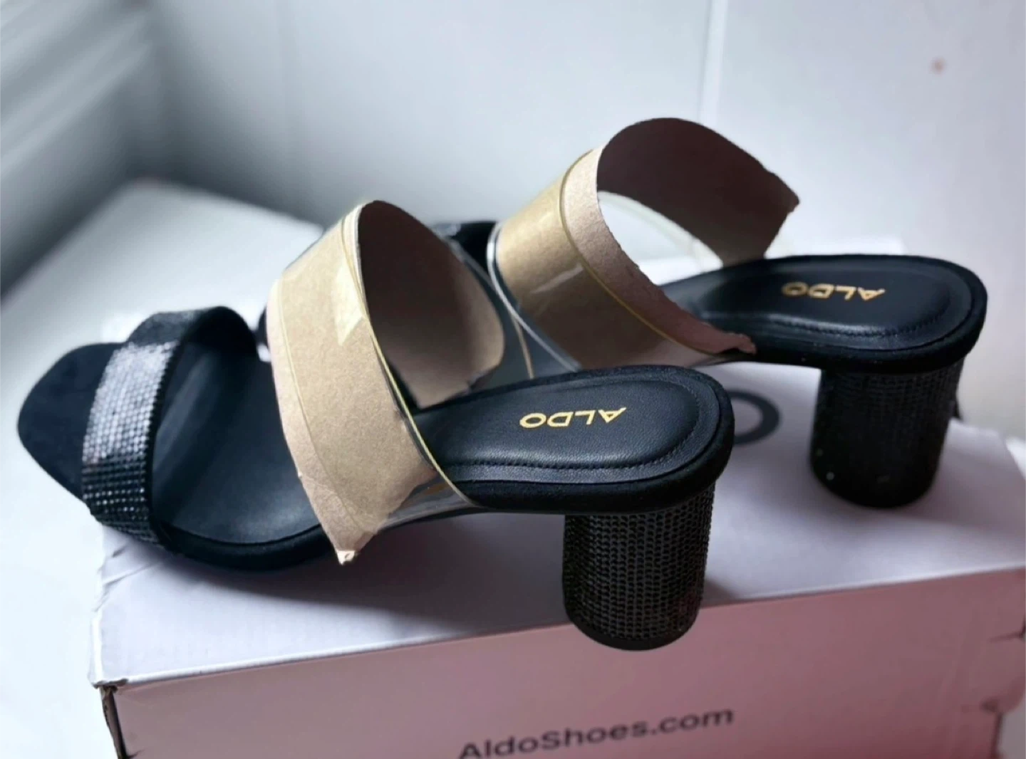ALDO Black Mules with Rhinestone Strap and Clear Band