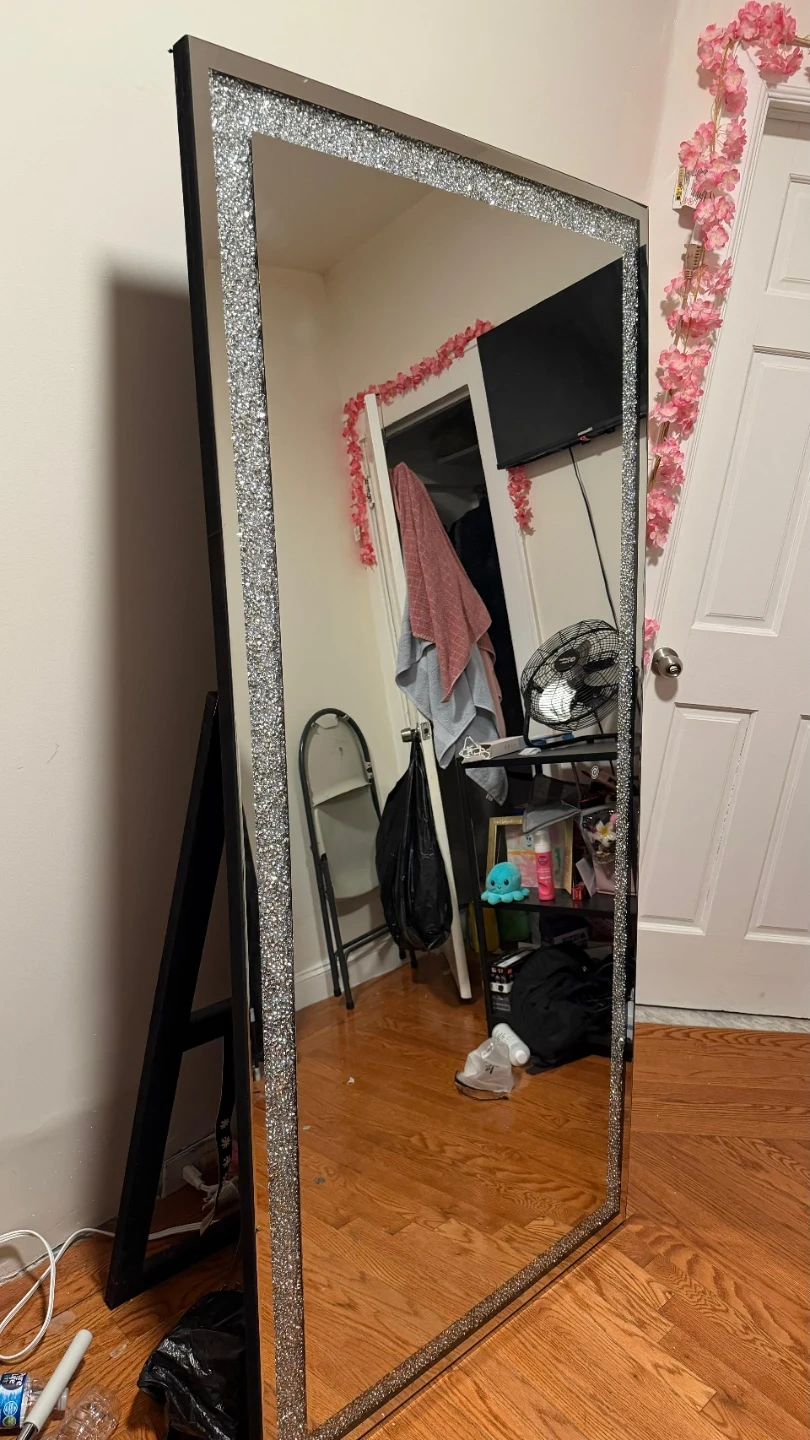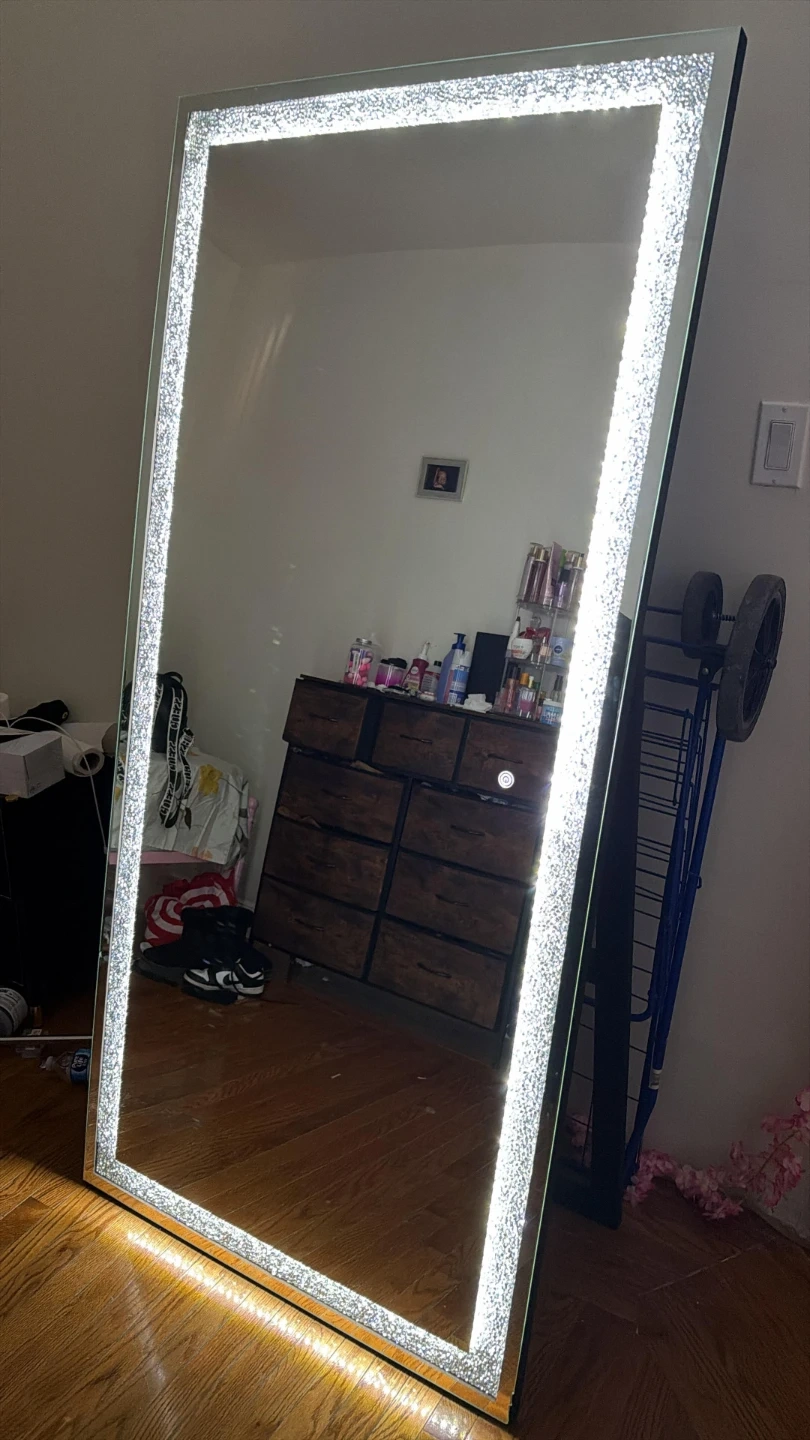 Gorgeous full-length mirror with a dazzling crystal-encrusted frame and built-in LED lights. It's perfect for dressing rooms or adding a touch of glamour to any space. Stand or lean it anywhere for a beautiful focal point!
