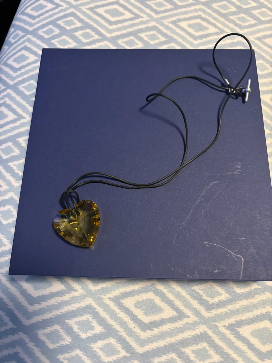 This is a Swarovski heart pendant necklace. It comes with a black cord and a silver-tone toggle clasp. The crystal pendant is a warm amber colour. It's a lovely accessory for everyday wear!