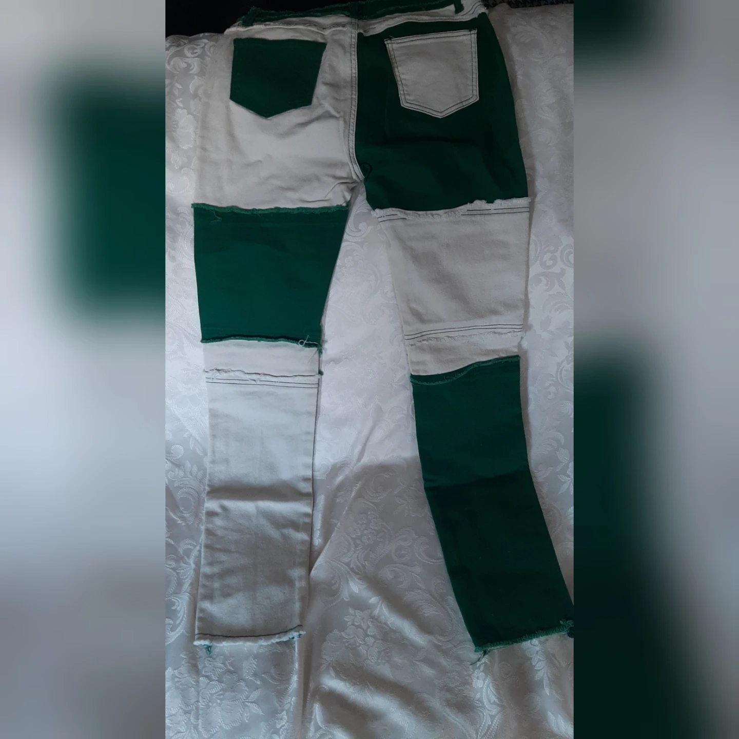 These unique patchwork jeans feature a two-tone design with green and off-white panels. They're finished with frayed hems for a stylish, deconstructed look. Denim material.
