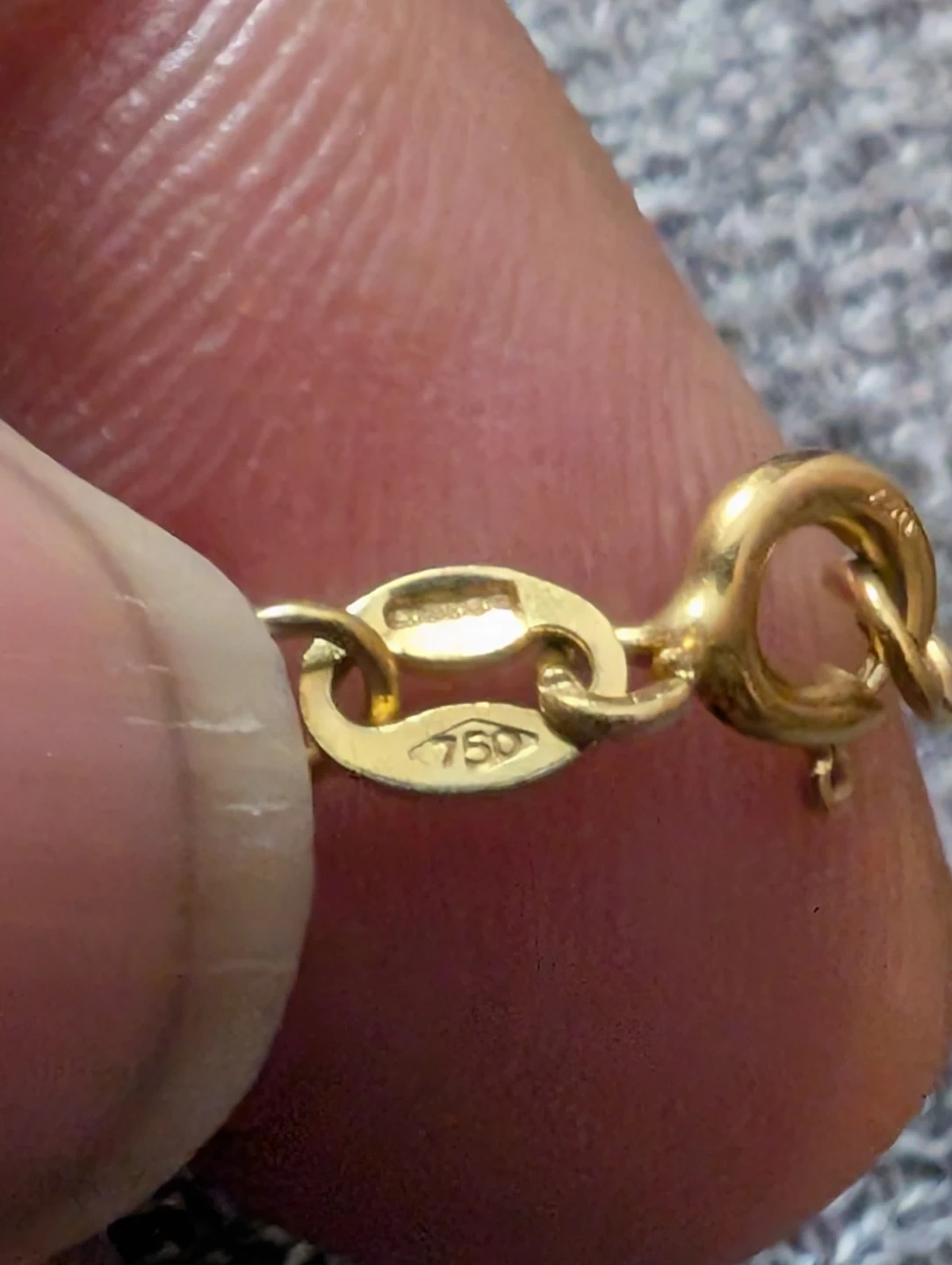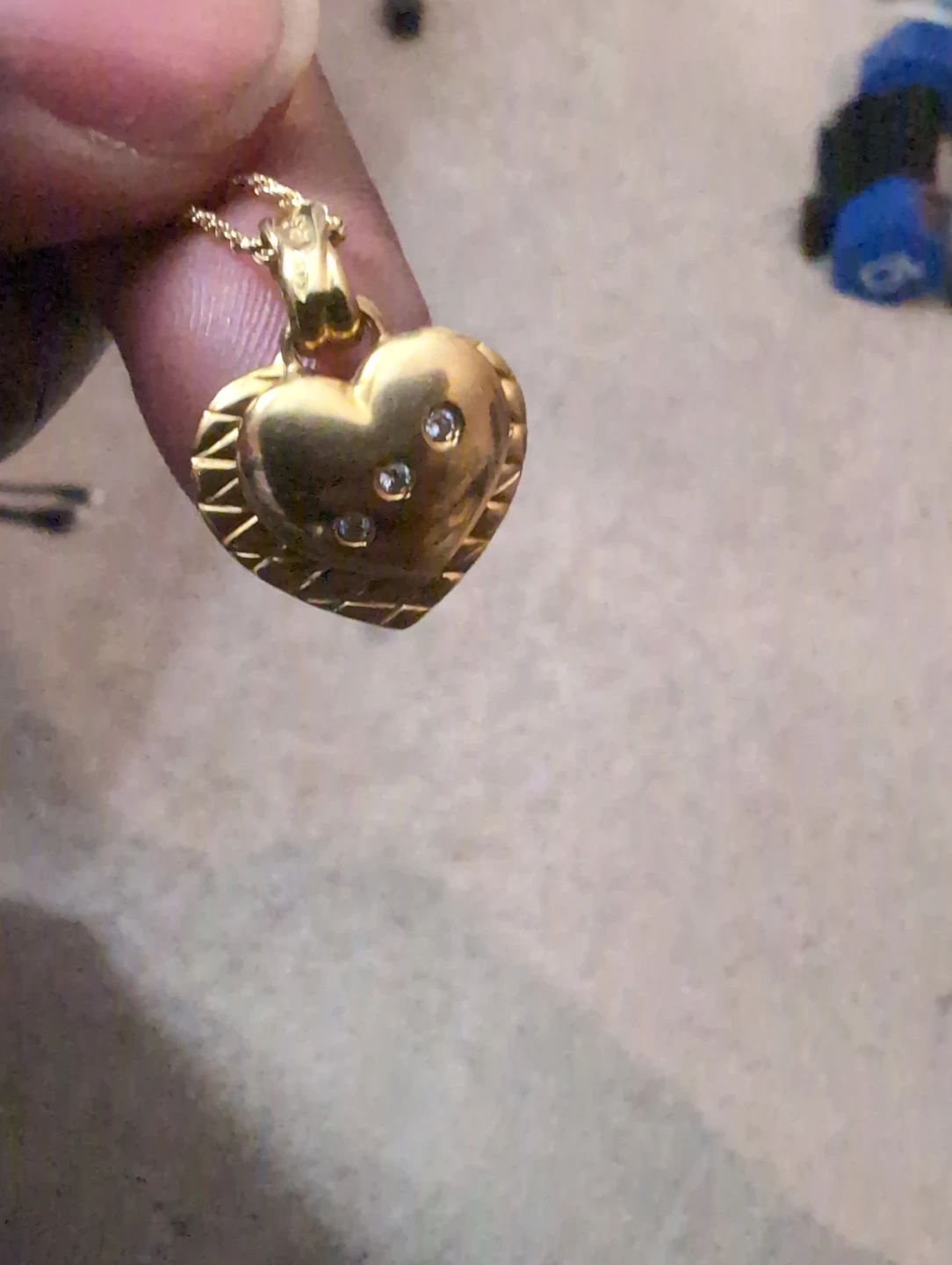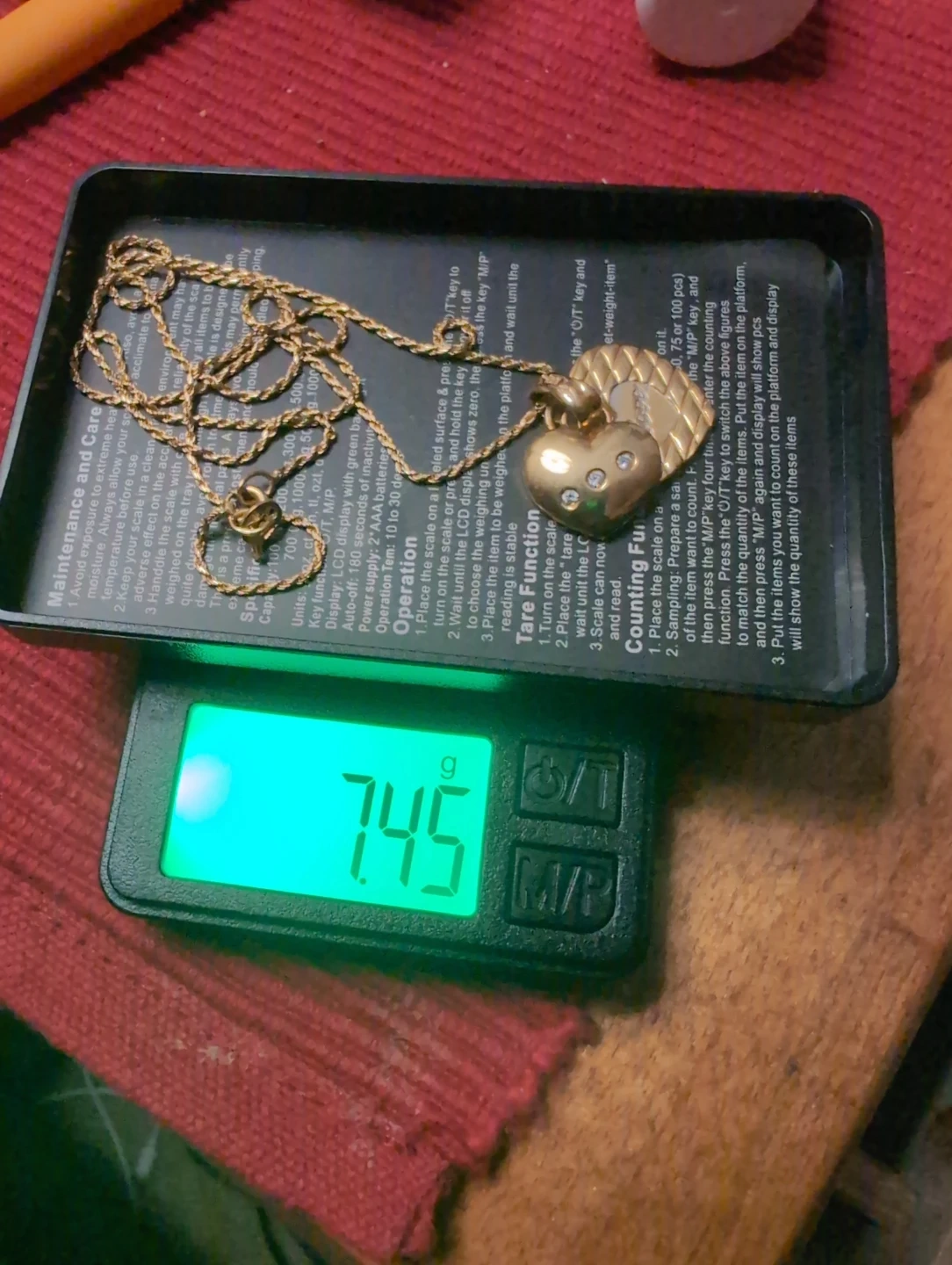 Selling a lovely gold heart pendant and necklace. Both marked as 750, which indicates 18K gold.