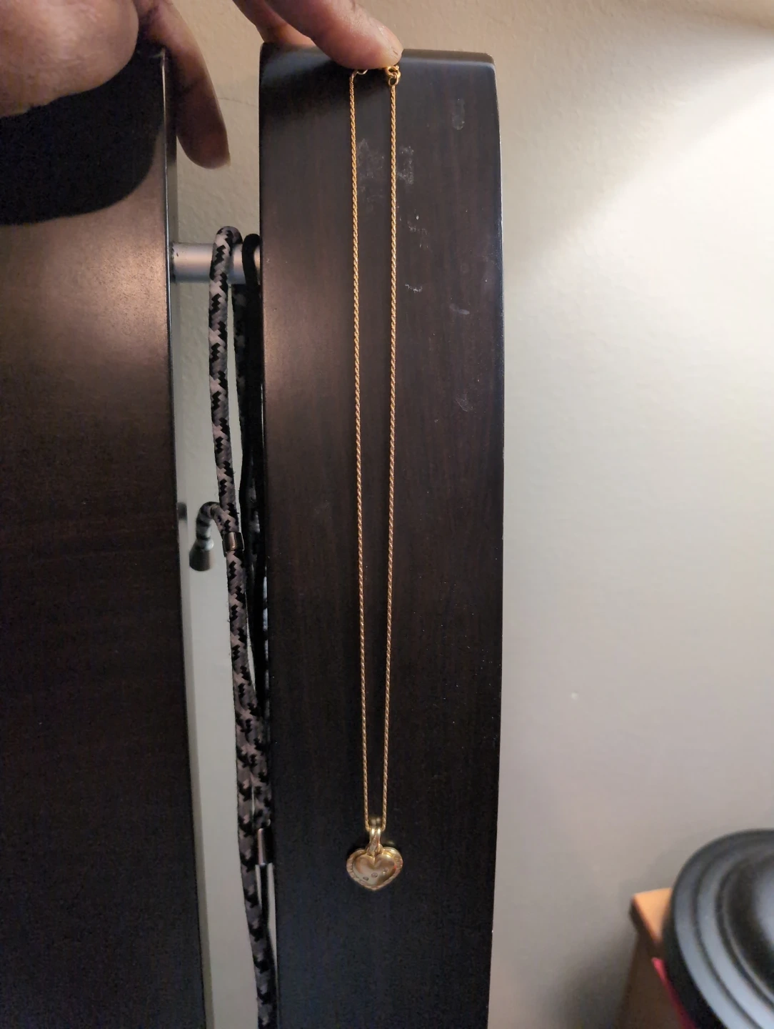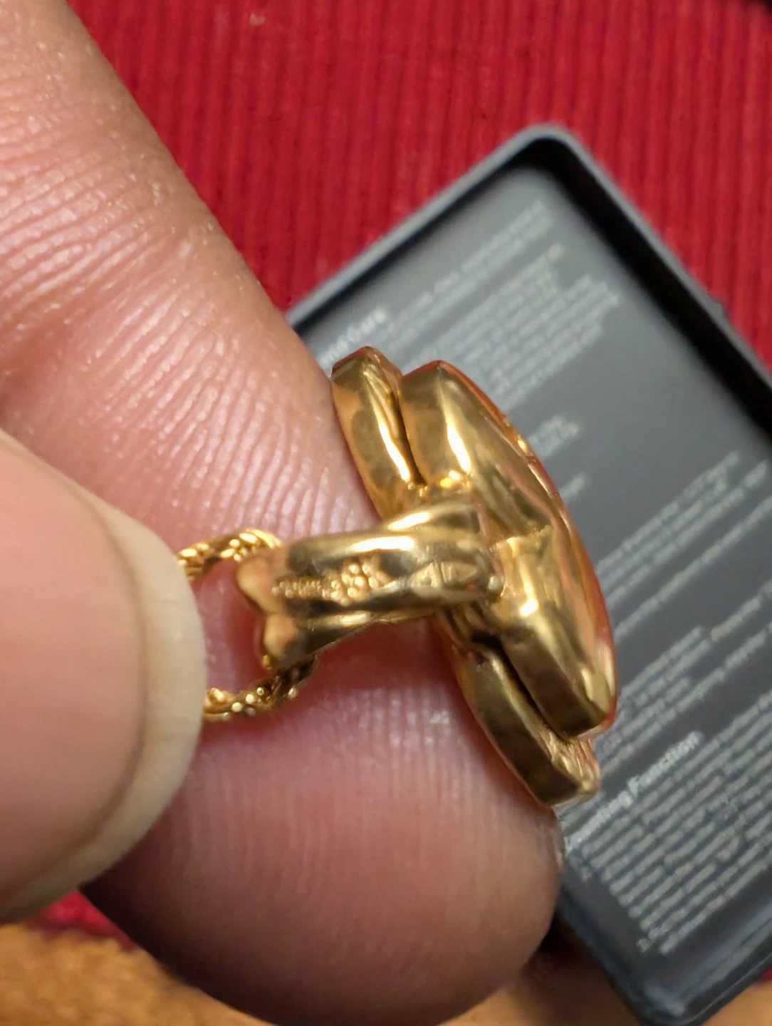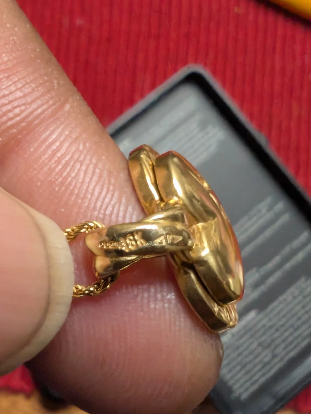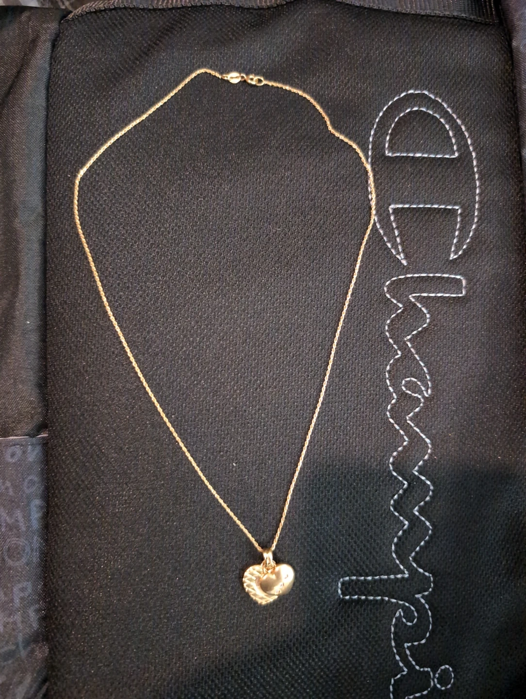 Selling a lovely gold heart pendant and necklace. Both marked as 750, which indicates 18K gold.
