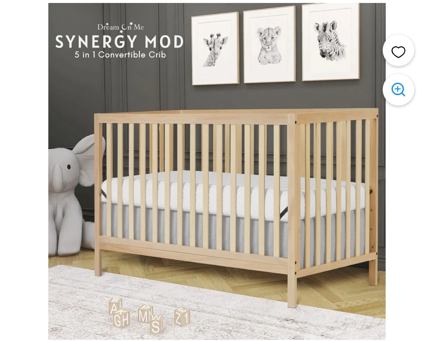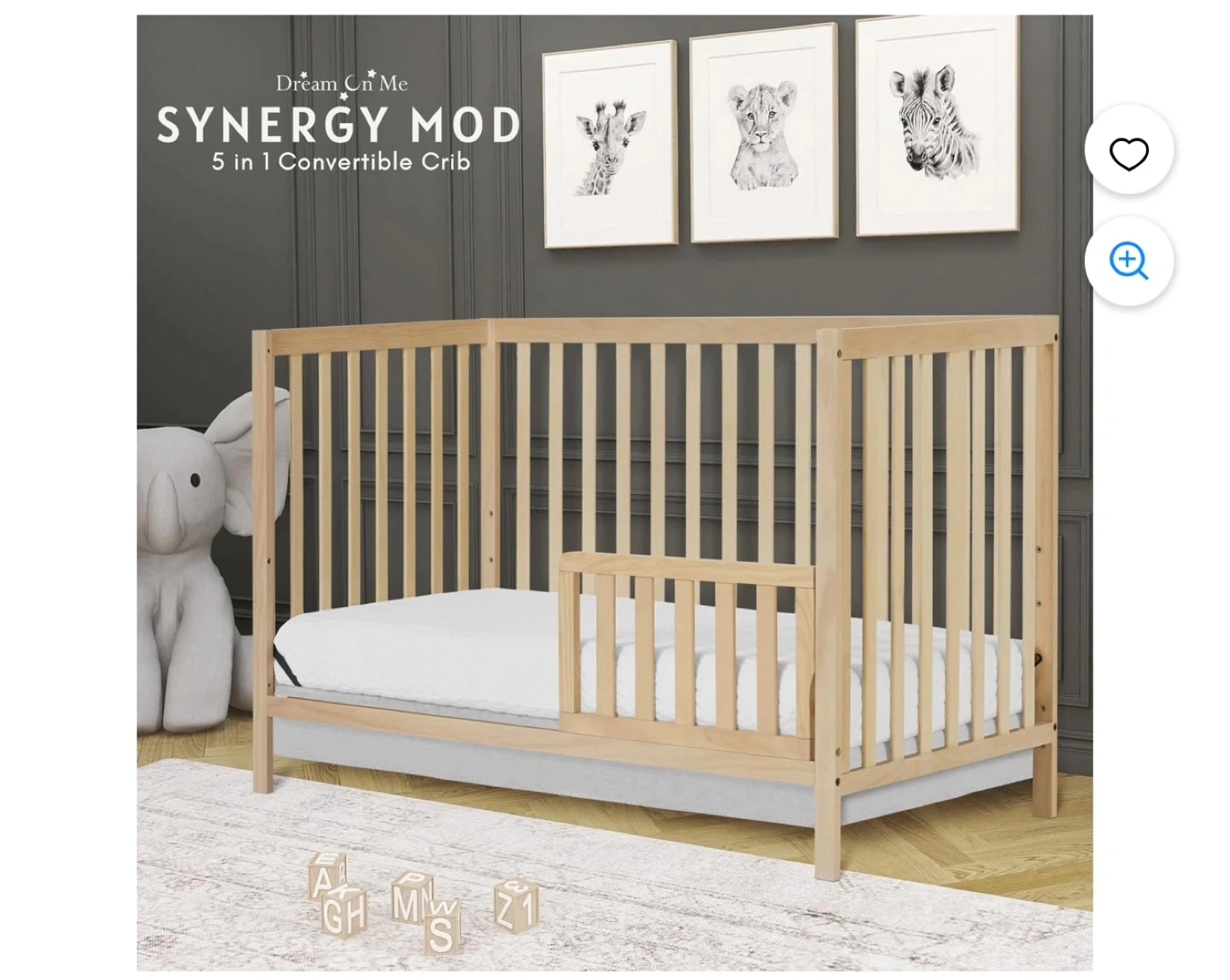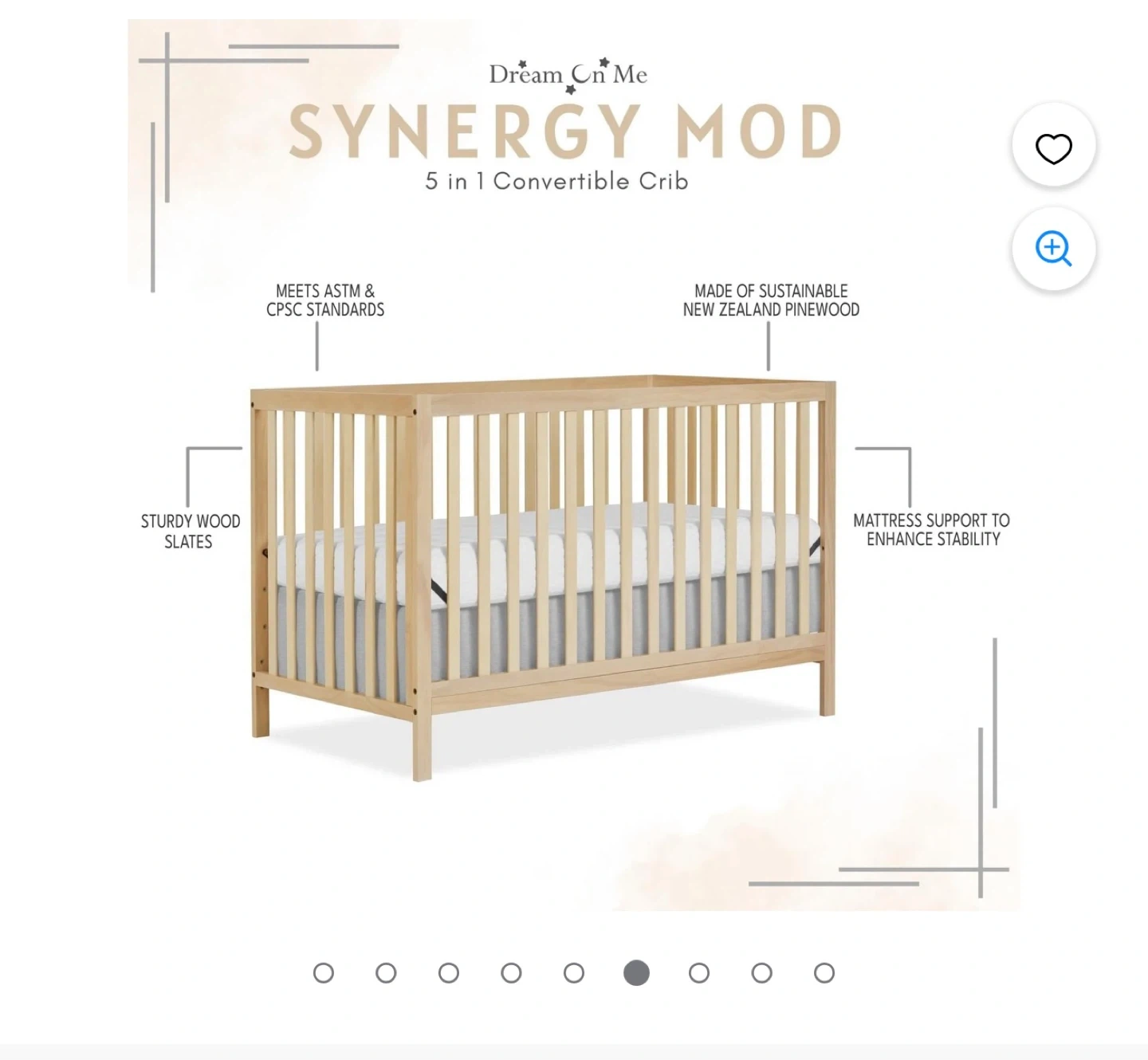 This is a 5-in-1 convertible crib from Dream On Me. It's made of sustainable New Zealand pinewood and meets ASTM & CPSC standards. This crib converts to a toddler bed, daybed/kids sofa, and full-size bed. Conversion kits sold separately.