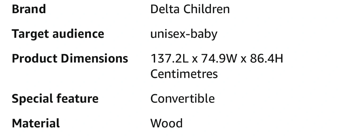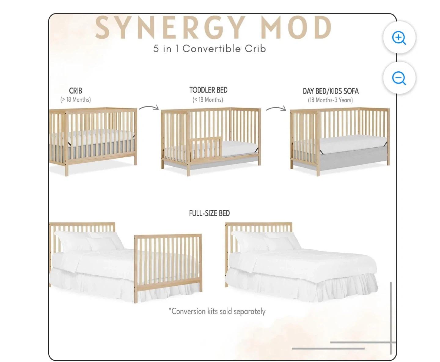 This is a 5-in-1 convertible crib from Dream On Me. It's made of sustainable New Zealand pinewood and meets ASTM & CPSC standards. This crib converts to a toddler bed, daybed/kids sofa, and full-size bed. Conversion kits sold separately.