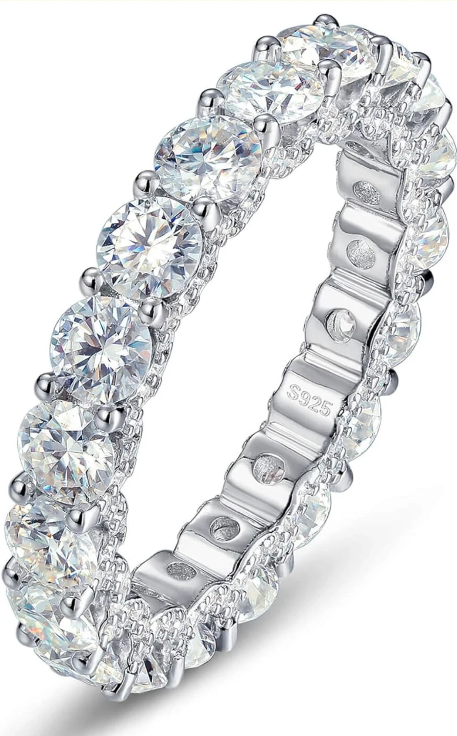 ¡Vendo un anillo de moissanita de plata 925 completamente nuevo, talla 8! Tiene una moissanita de 2,10 carats, calidad VVS, color D. Incluye la caja original. Precio original: $672.99.