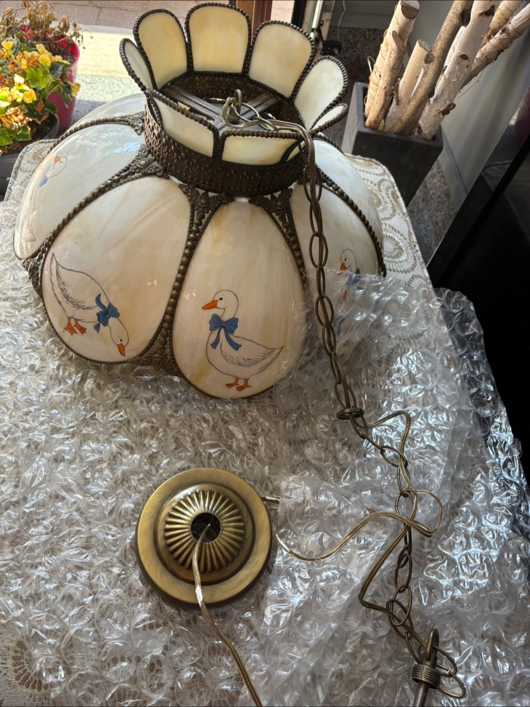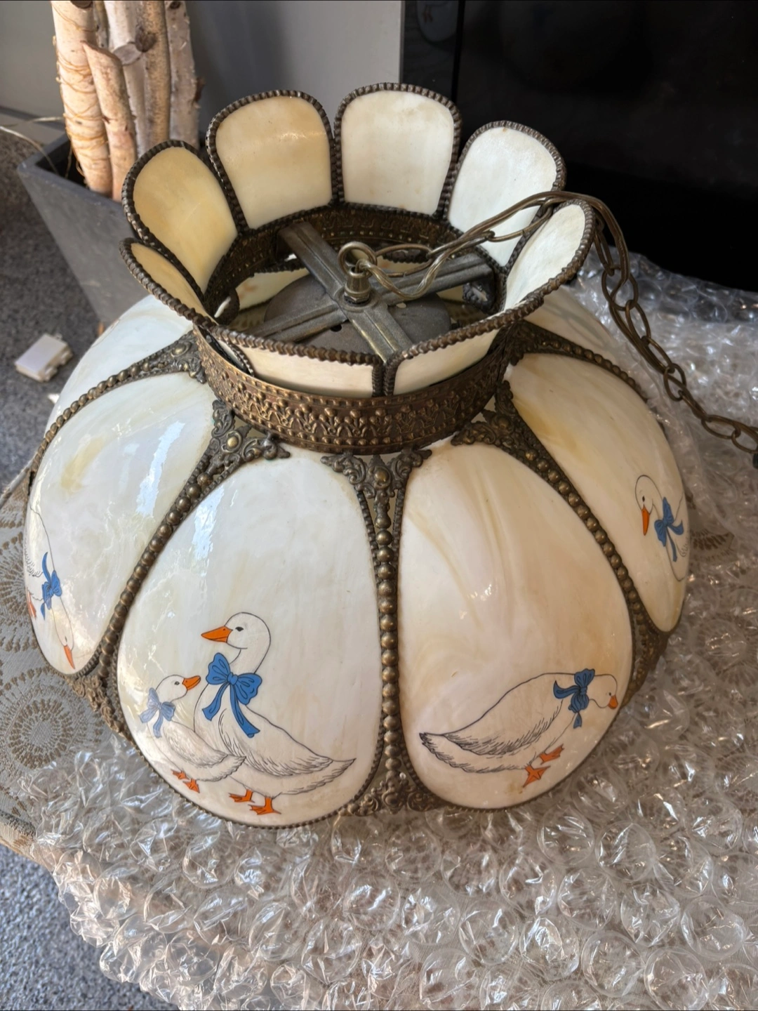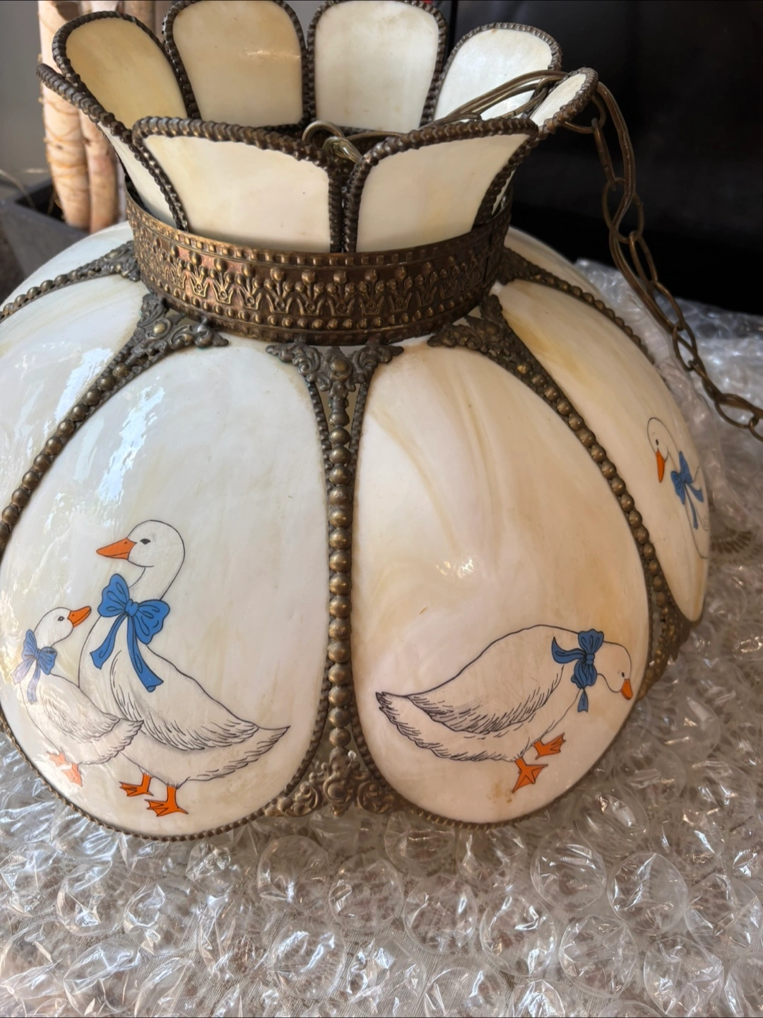 Selling a charming vintage glass hanging lamp with a unique duck pattern. It adds a touch of whimsy and country style to your kitchen or any room. The lamp features a decorative metal frame and a chain for hanging and has been stored in bubble wrap and plastic!