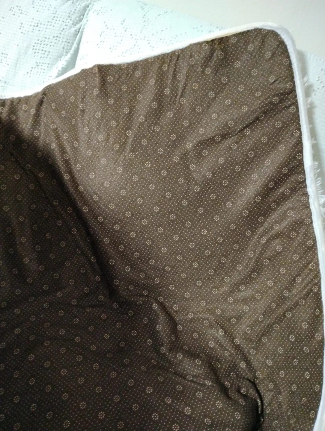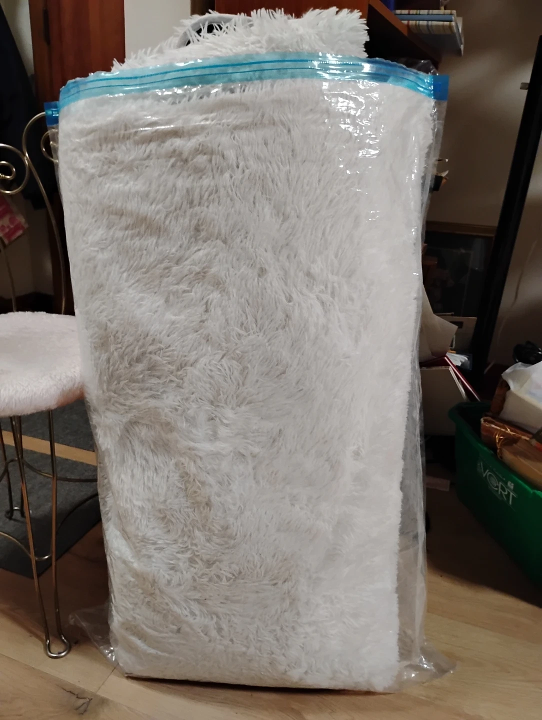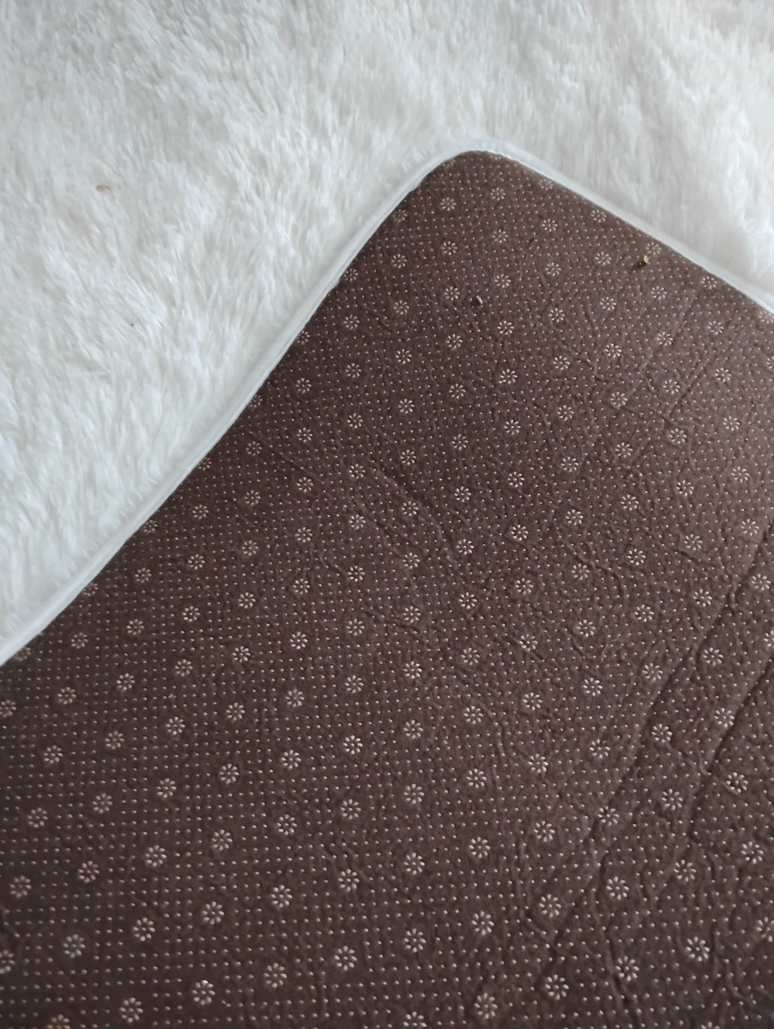 This is a soft, white shaggy rug. It has a non-slip backing. Measures approximately 6x6 feet.