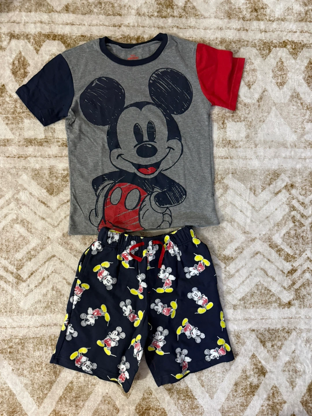 This is a two-piece set featuring a Mickey Mouse graphic t-shirt and matching shorts with a playful all-over Mickey print. The t-shirt is made of a cotton blend, and the shorts are 100% cotton. The set is size 7-8.