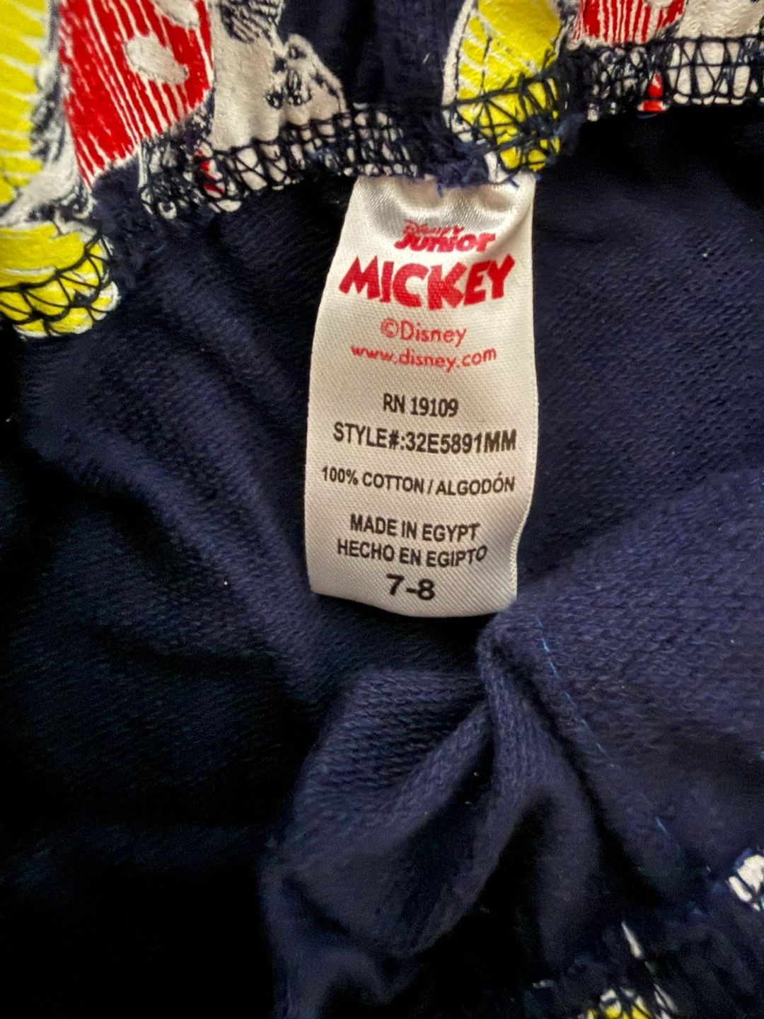 This is a two-piece set featuring a Mickey Mouse graphic t-shirt and matching shorts with a playful all-over Mickey print. The t-shirt is made of a cotton blend, and the shorts are 100% cotton. The set is size 7-8.