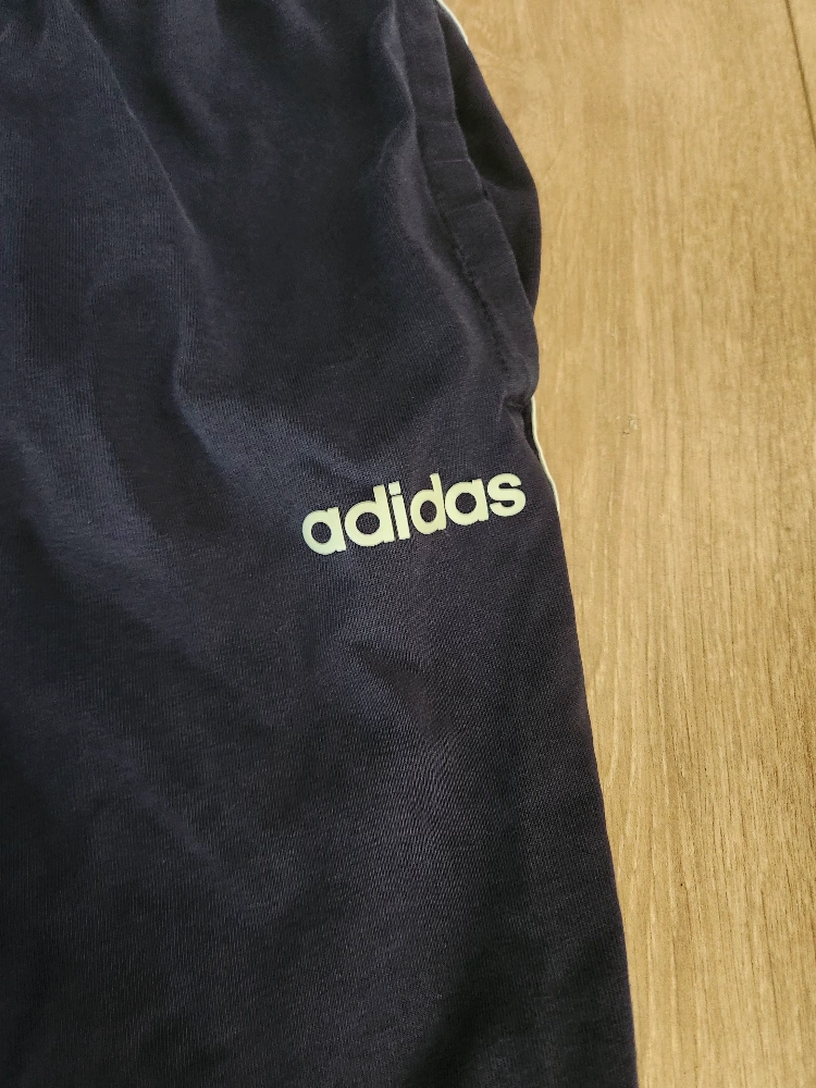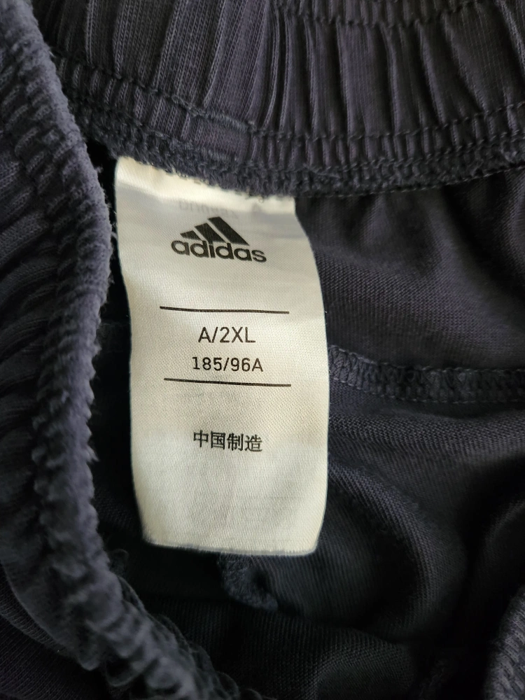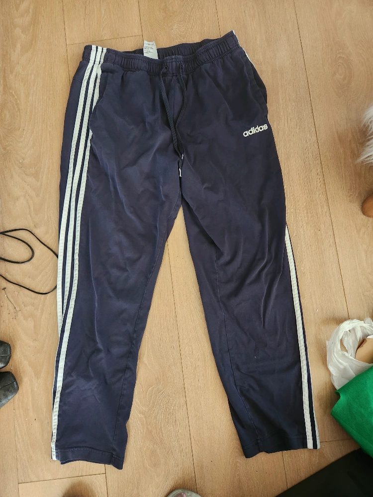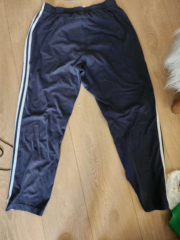 Dark blue Adidas track pants with white stripes. Size A/2XL. Elastic waistband with drawstring. Two front pockets. Machine washable.