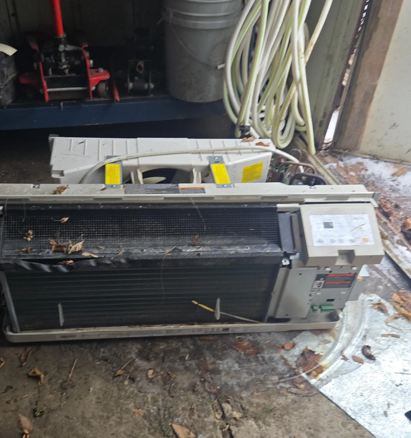 This is a window air conditioner unit. It appears to be a standard size for a window installation. It's beige in colour and has a control panel on the side. Commercial heater/ ac/ dehumidifier. Has cover and housing. Not in picture. Works great. Only sitting for a few weeks.