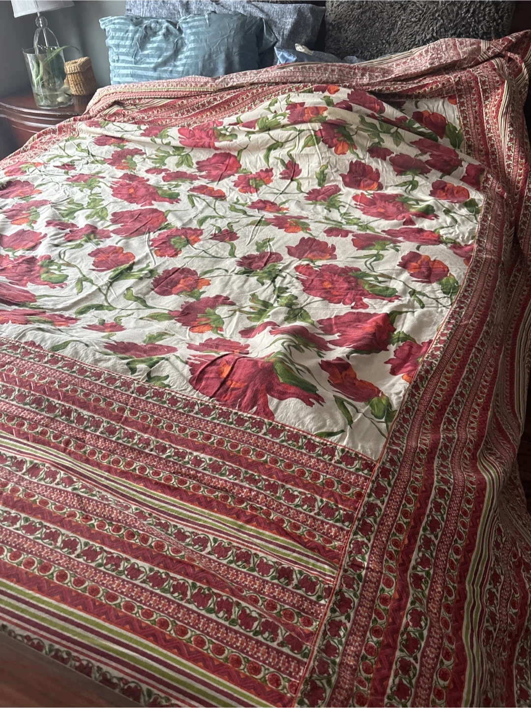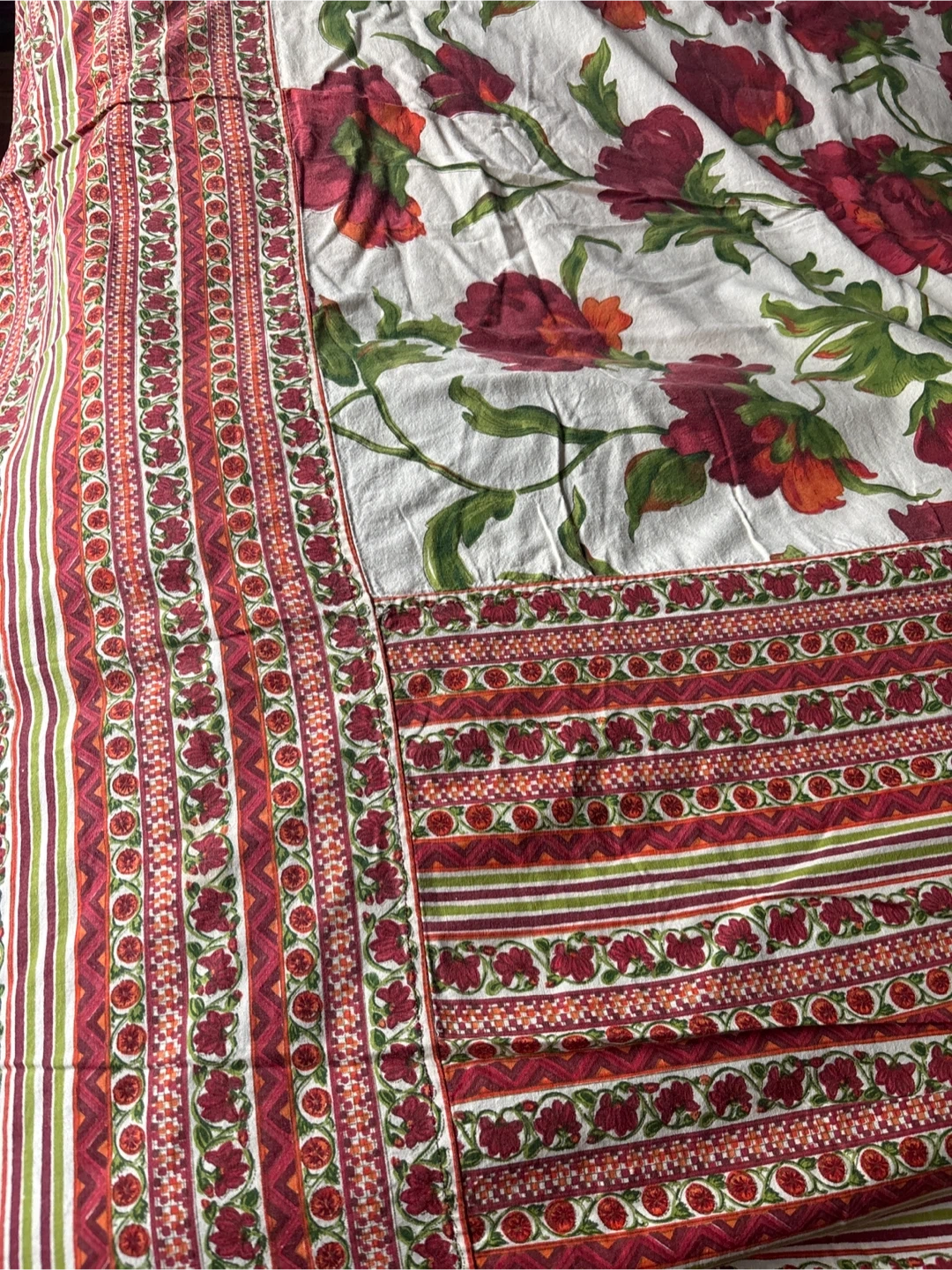 A beautiful duvet cover featuring a vibrant floral design on a cream background. It's made from 100% cotton for comfort and breathability. The intricate patterned borders add a touch of elegance. Great for refreshing your bedroom's look!