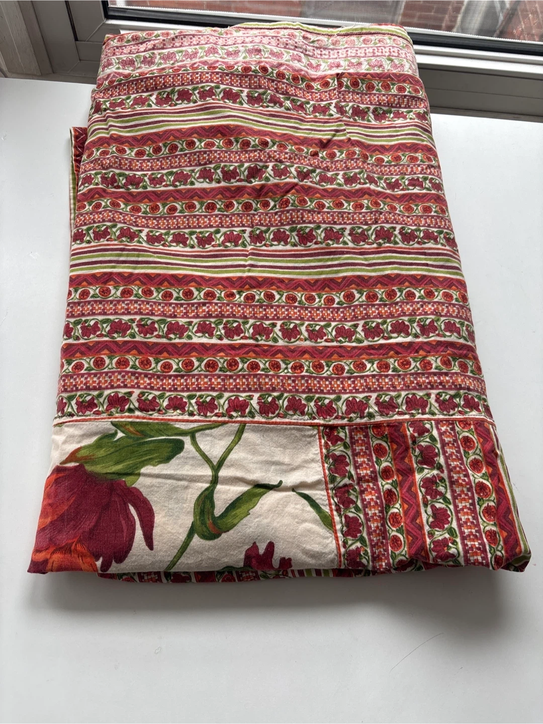 A beautiful duvet cover featuring a vibrant floral design on a cream background. It's made from 100% cotton for comfort and breathability. The intricate patterned borders add a touch of elegance. Great for refreshing your bedroom's look!