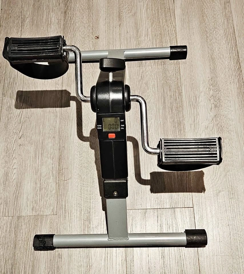 Compact pedal exerciser for leg or arm workouts. Perfect for under-desk use while working or watching TV. Foldable and adjustable tension knob to change resistance. Mechanical parts work perfectly and pedal smoothly. Note: LCD counter is not working (priced low accordingly).