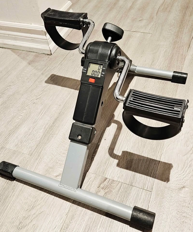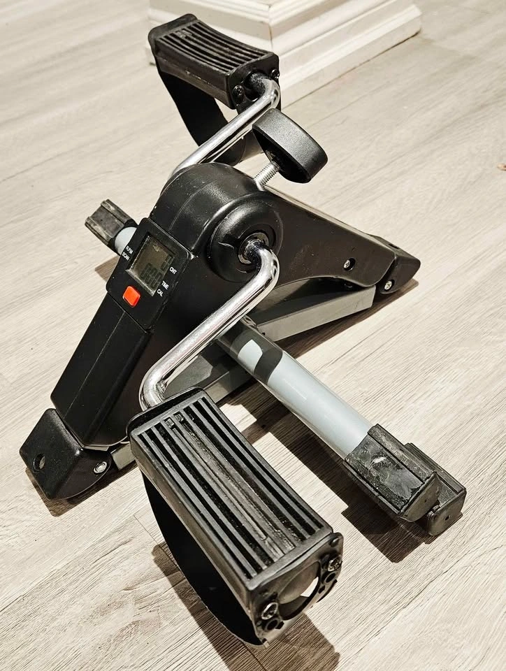 Compact pedal exerciser for leg or arm workouts. Perfect for under-desk use while working or watching TV. Foldable and adjustable tension knob to change resistance. Mechanical parts work perfectly and pedal smoothly. Note: LCD counter is not working (priced low accordingly).