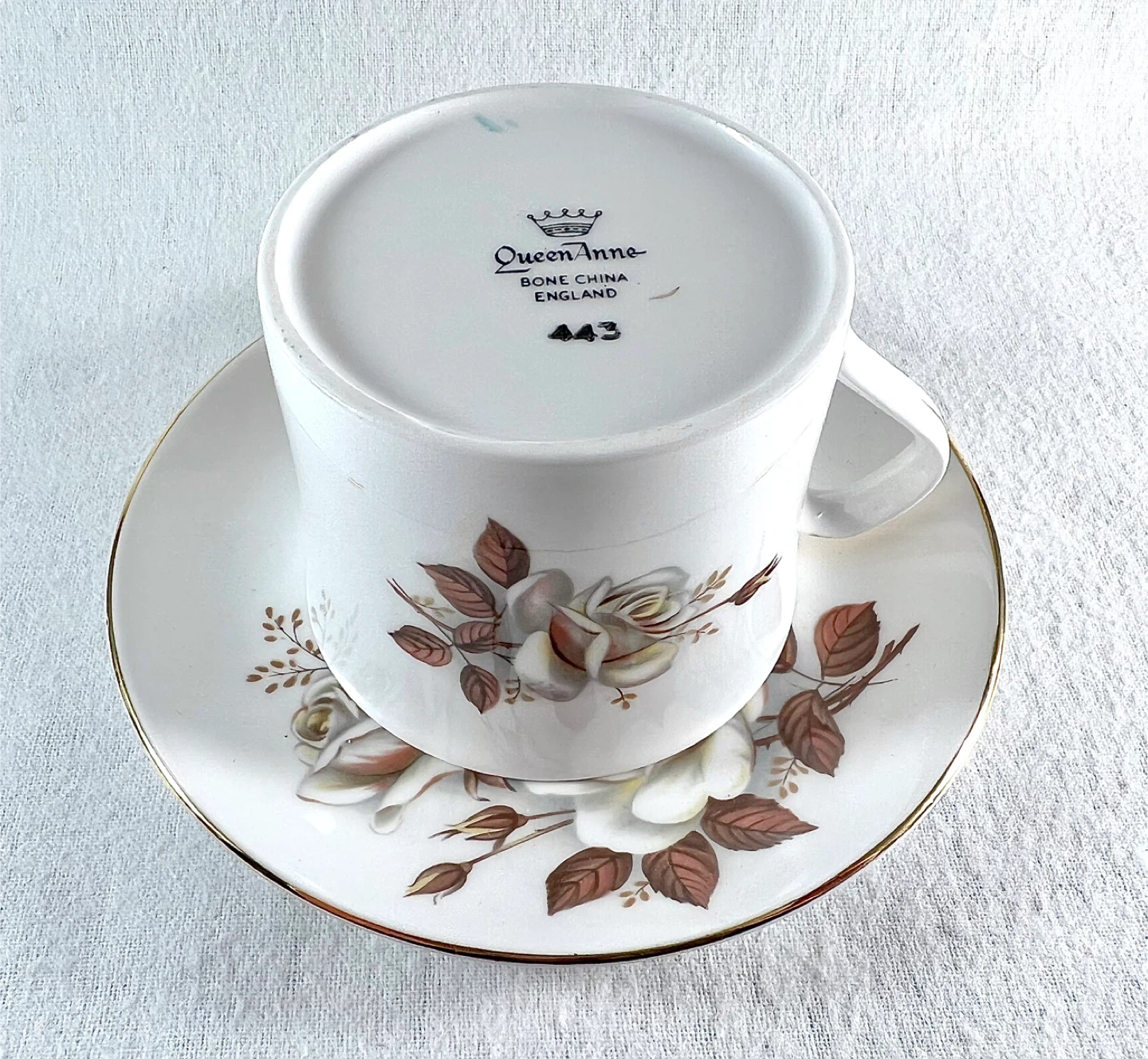 Vintage Queen Anne bone china teacup with large white rose pattern. No chips, cracks, crazing or gold loss. Both pieces ping/ring