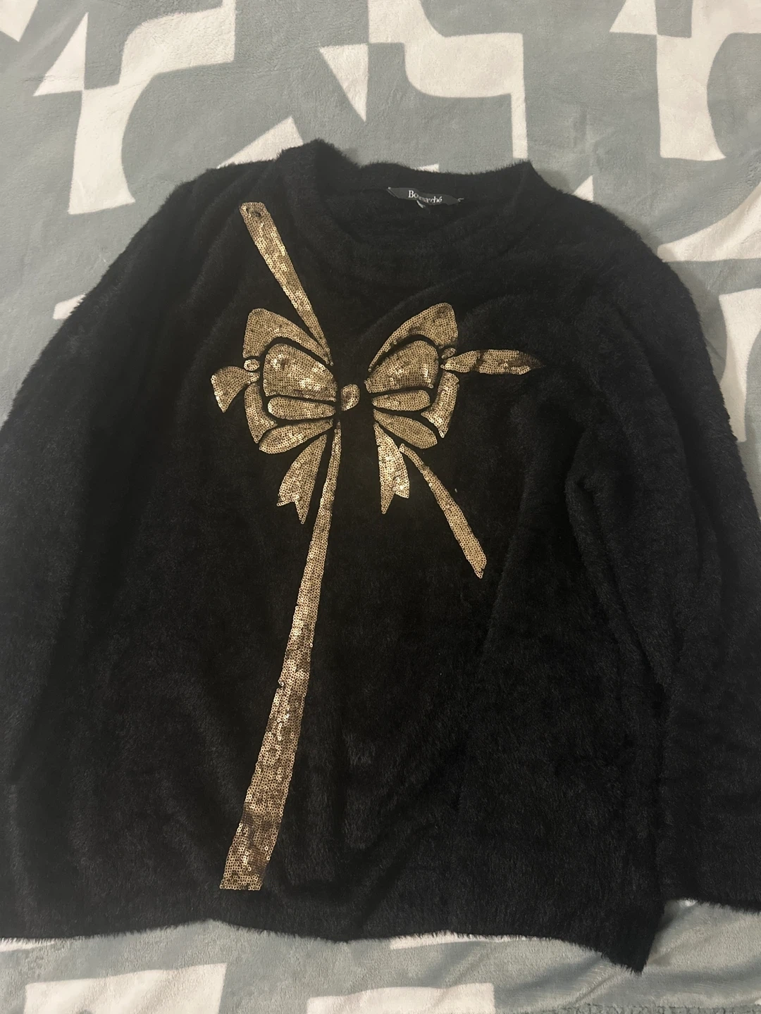 This Bonmarché sweater is black and features a gold sequin bow design. It's a size 24. The material is soft and fuzzy, making it cozy for cooler weather.